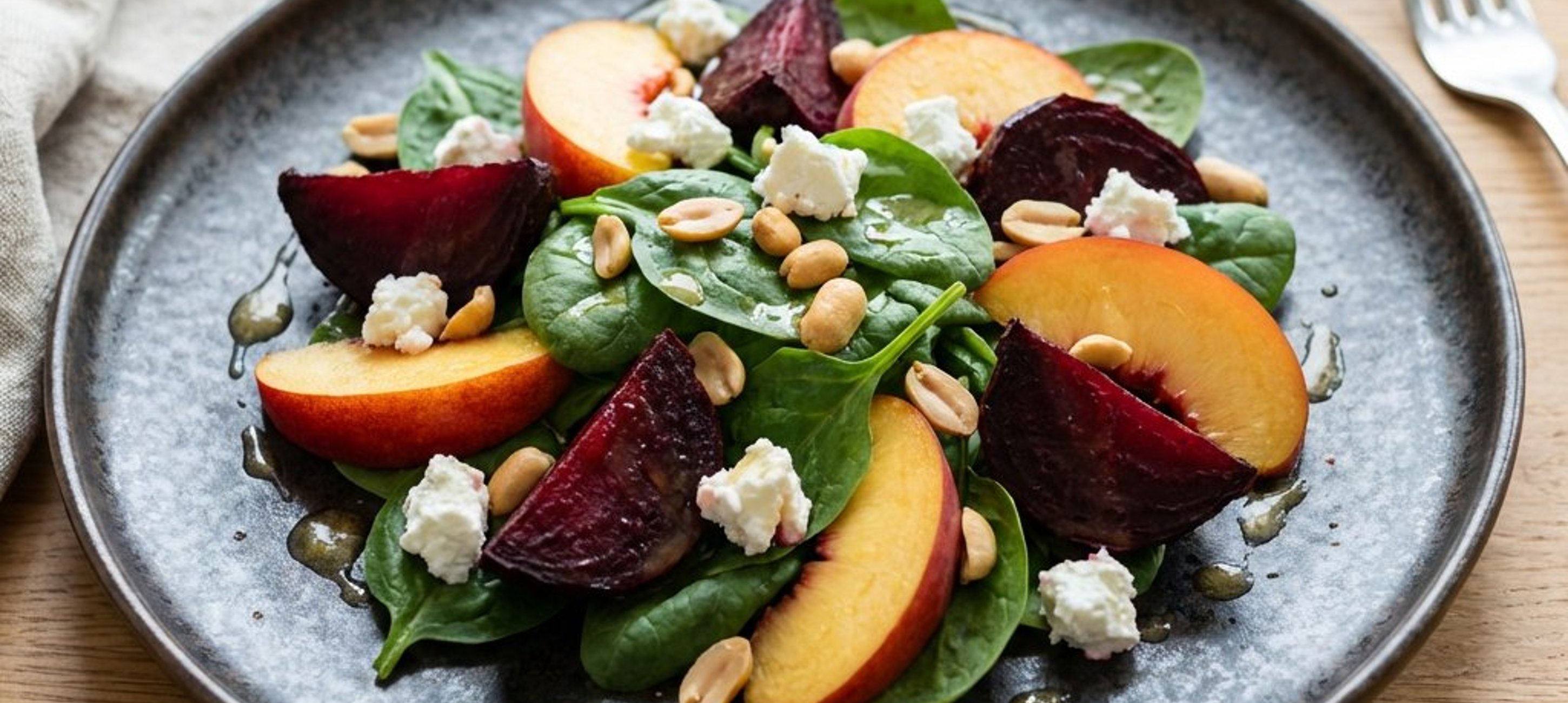 - 9Tálaláskor helyezzük a spenótleveleket a tányérokra, osszuk el rajtuk a céklát, a nektarint, a kecskesajtot és a csirkehúst. Végül locsoljuk meg a maradék öntettel, és szórjuk meg a pirított mogyoróval.