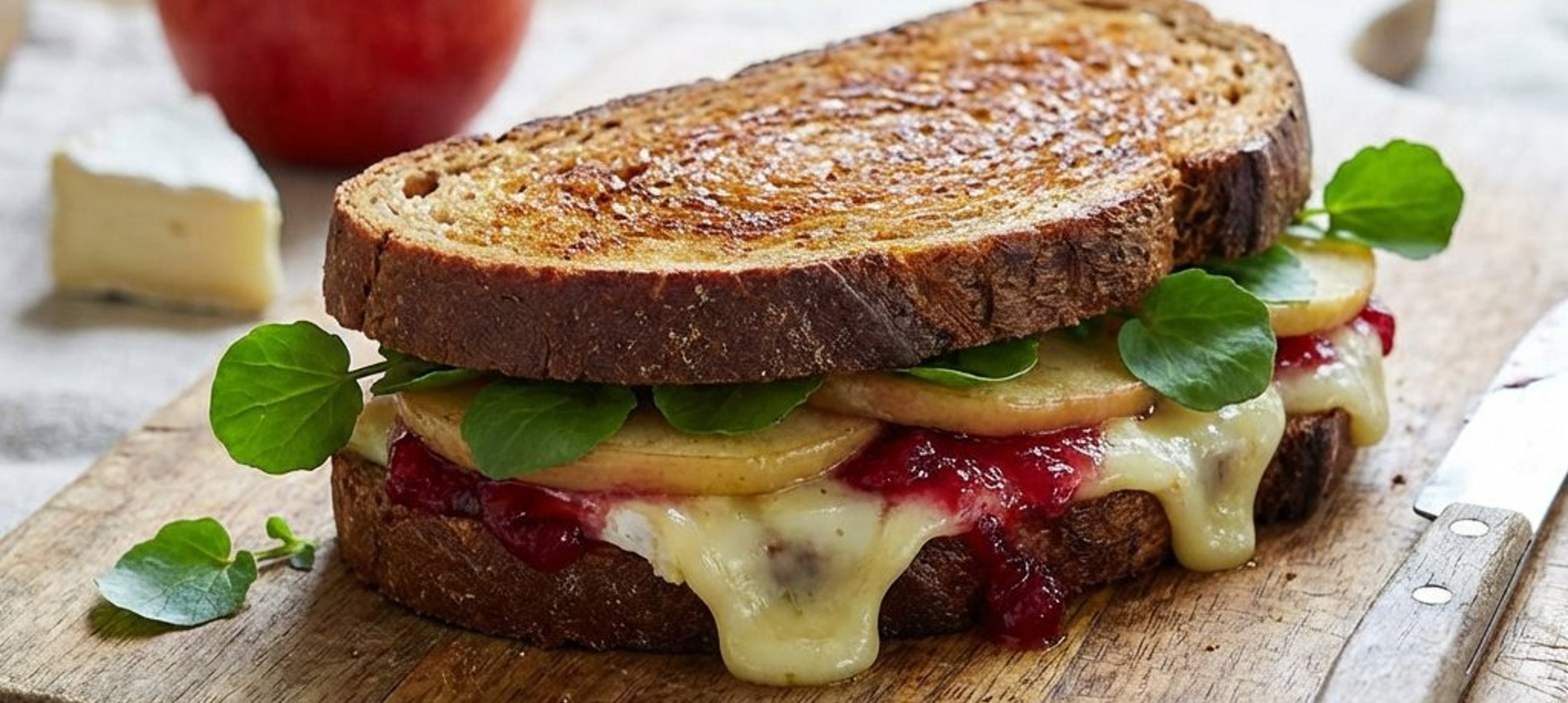 - 1Hevítsünk fel egy serpenyőt közepes lángon. Helyezzünk bele egy szelet kenyeret a vajas oldalával lefelé. Fektessünk rá néhány szelet sajtot, majd az áztatott almaszeleteket. Szórjuk meg egy kevés rukkolával, és kanalazzunk rá az áfonyalekvárból.