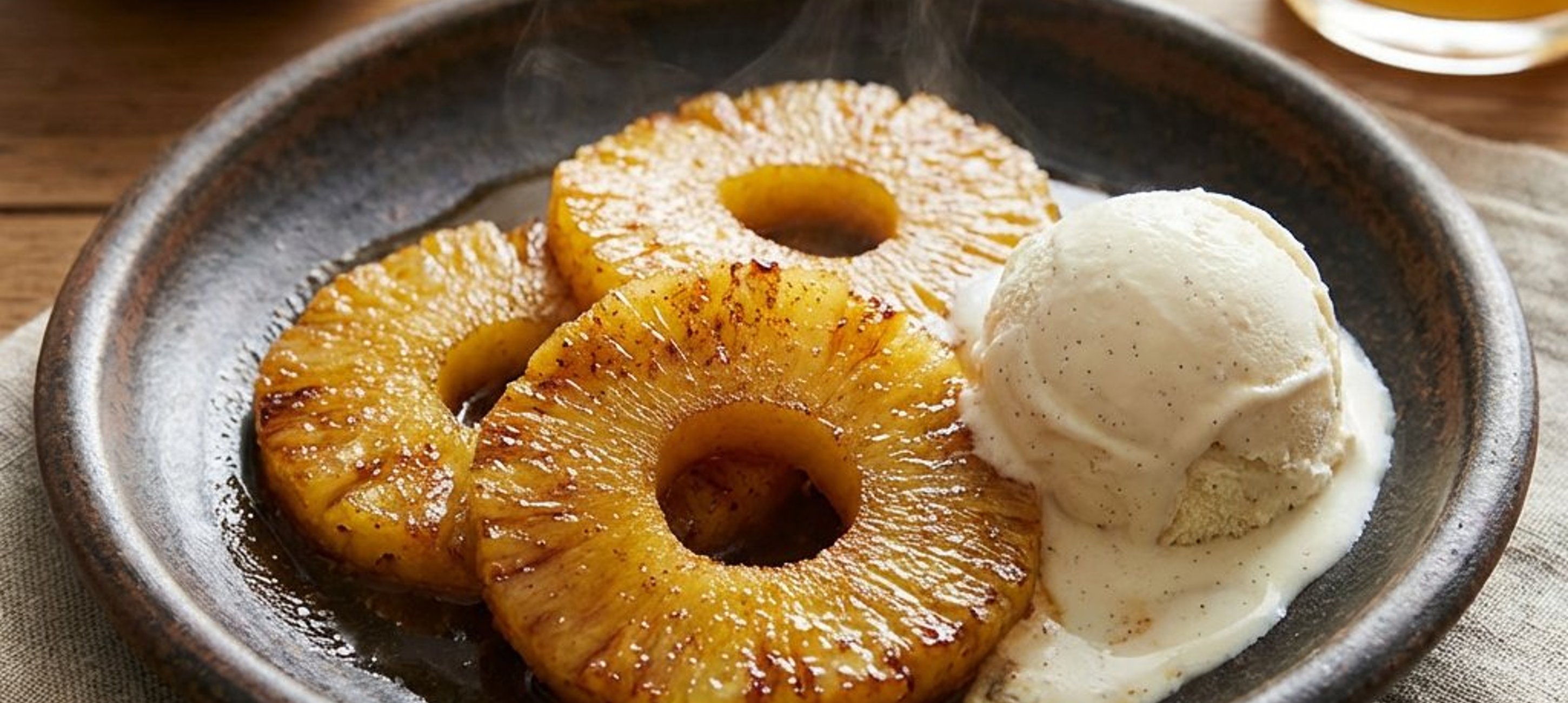 - 1Egy serpenyőben olvasszuk fel a kristálycukrot, amíg világos karamell színt kap. Öntsük hozzá a narancslevet, adjuk hozzá a fahéjrudat, és kevergessük, amíg a cukor teljesen feloldódik. Tegyük bele a grillezett ananászkarikákat, és forraljuk a mártást az egyharmadára. Végül öntsük rá a Metaxát, és óvatosan gyújtsuk meg (flambírozzuk). Tálaljuk azonnal, egy-egy gombóc vaníliafagylalttal kísérve.