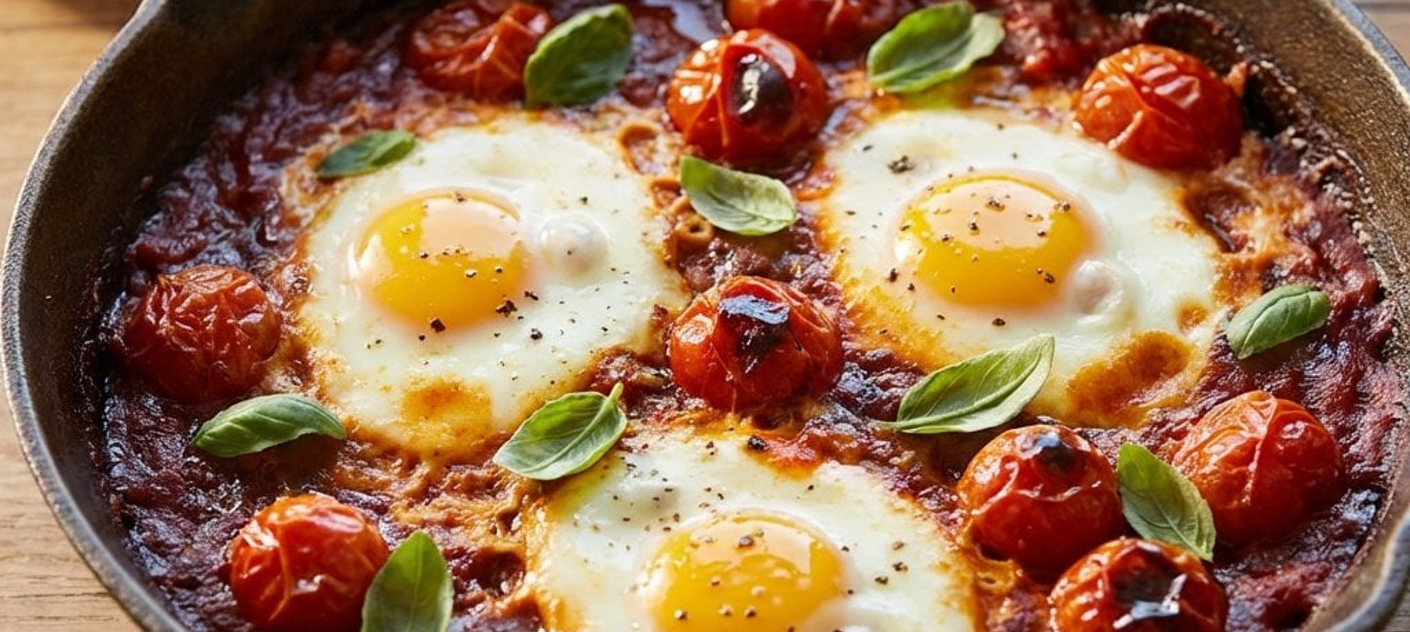 - 3Üssük a tojásokat a paradicsomos alapra, sózzuk és borsozzuk meg őket, majd fedjük le a serpenyőt. Süssük kb. 3 percig, vagy amíg a tojásfehérje meg nem szilárdul.
