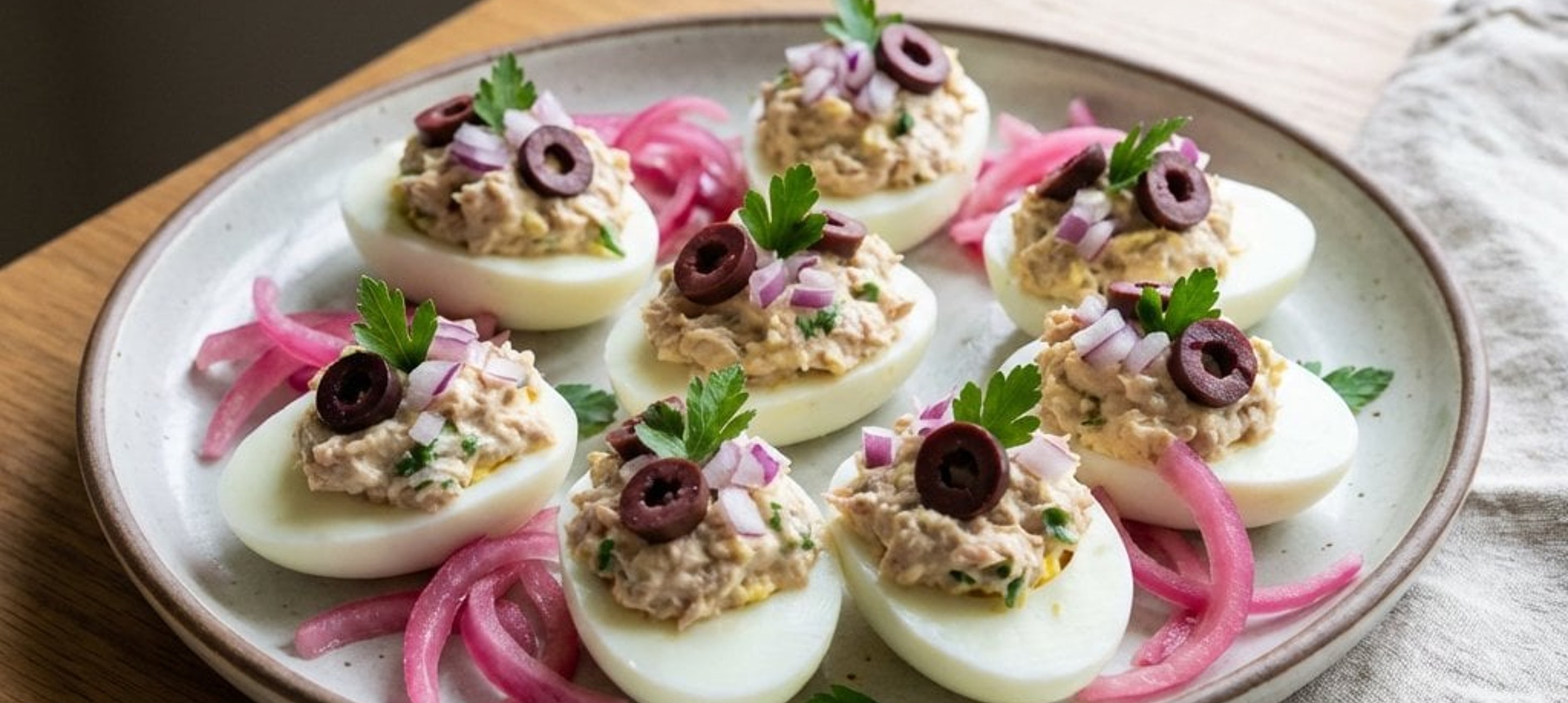 - 3A tojásfehérjék mélyedéseibe kanalazzuk bele a tonhalas tölteléket, majd helyezzük a tetejükre a félretett tojássárgákat. Tálaláskor halmozzuk a tányérra a pácolt hagymát, helyezzük rá a töltött tojásokat, és díszítsük a paprikacsíkokkal és friss petrezselyemmel.