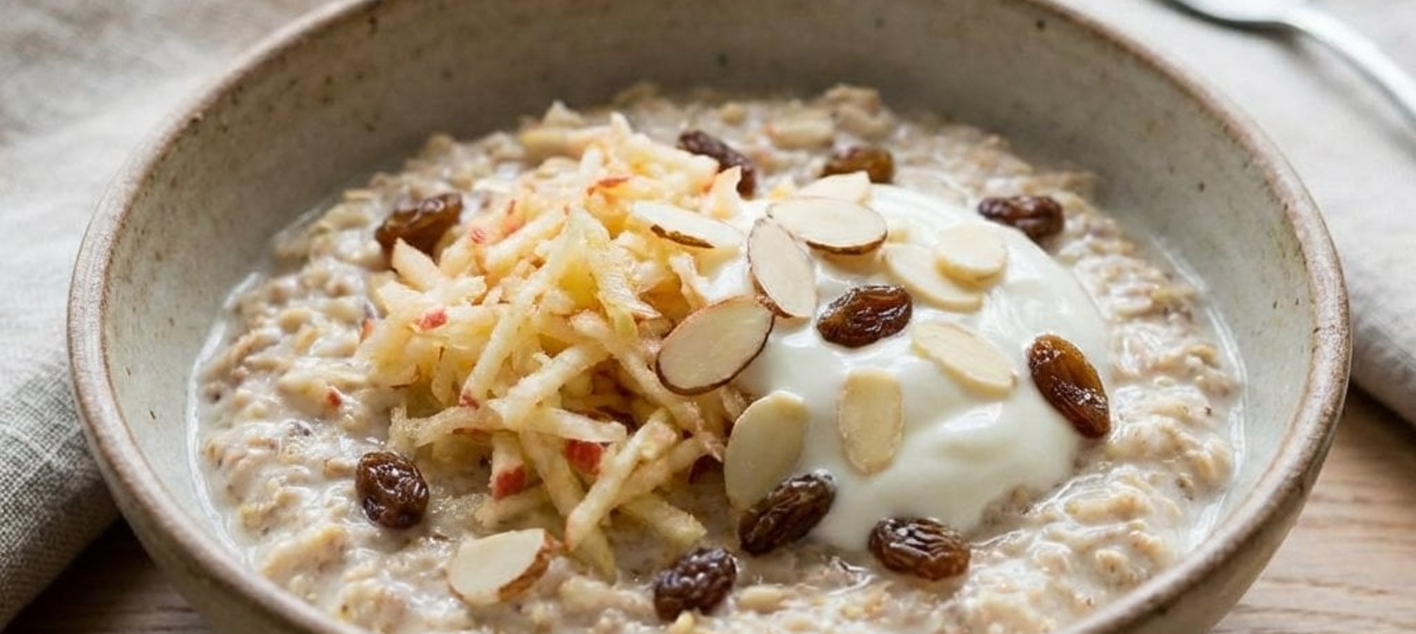 - 3Az ízesített almához keverd hozzá a beáztatott zabpelyhet (a maradék tejjel együtt) és a görög joghurtot. Oszd szét tálkákba, majd szórd meg a tetejét szeletelt mandulával és mazsolával. Azonnal fogyasztható.