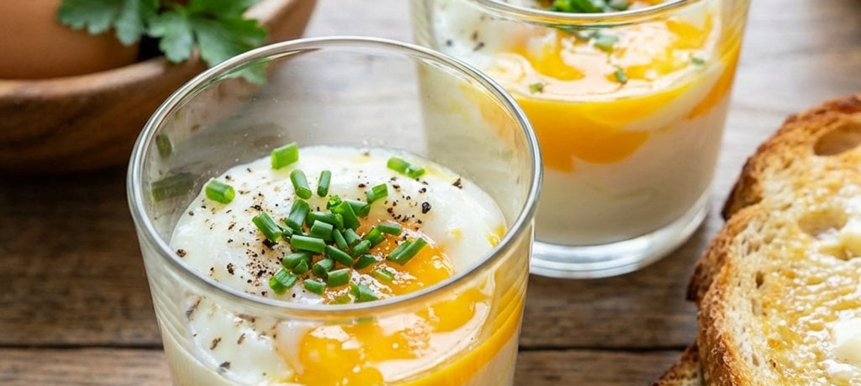 - 1Amíg a tojások főnek, készítsen elő négy tálalópoharat, kistányérokat és hosszú kanalakat. Aprítsa fel a friss fűszernövényeket, pirítsa meg a tósztkenyeret, és kenje meg vajjal.