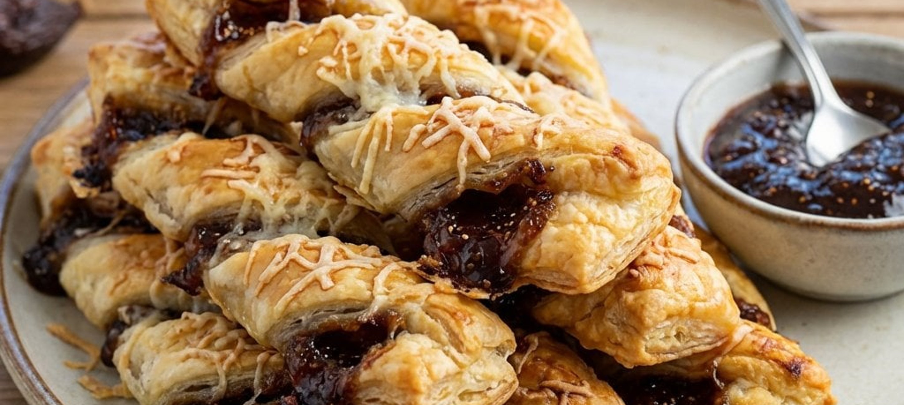 - 4Az egyik tésztalapot kenjük meg a fügelekvárral és szórjuk meg a reszelt pecorino sajttal. Fedjük le a másik tésztalappal (a tojásos felével lefelé), és óvatosan nyomkodjuk össze őket. A tésztát vágjuk 1 cm széles csíkokra, csavarjuk meg őket spirál alakban, majd helyezzük sütőpapírral bélelt tepsire. Süssük az előmelegített sütőben 15–20 percig, amíg aranybarnák lesznyek.