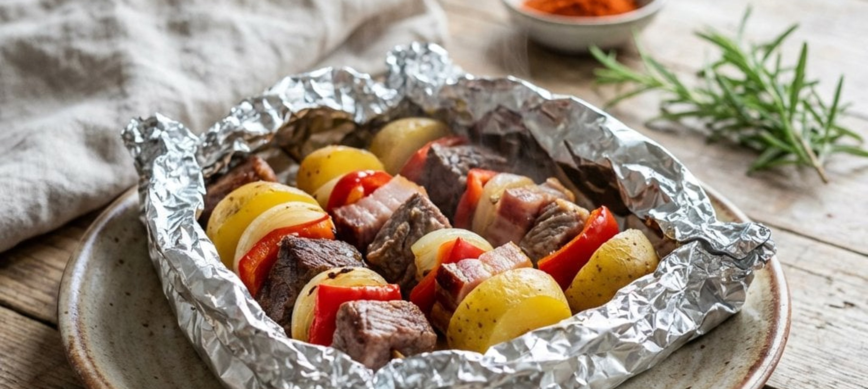 - 2A paradicsomot vágjuk vékony szeletekre, és fektessük az alufóliára. Helyezzük rá a nyársat, majd alaposan csomagoljuk be az alufóliába. Süssük a sütőben 30 percig. Miután kivettük, hagyjuk pihenni a fóliában még 10 percig. Tálaljuk friss kenyérrel.