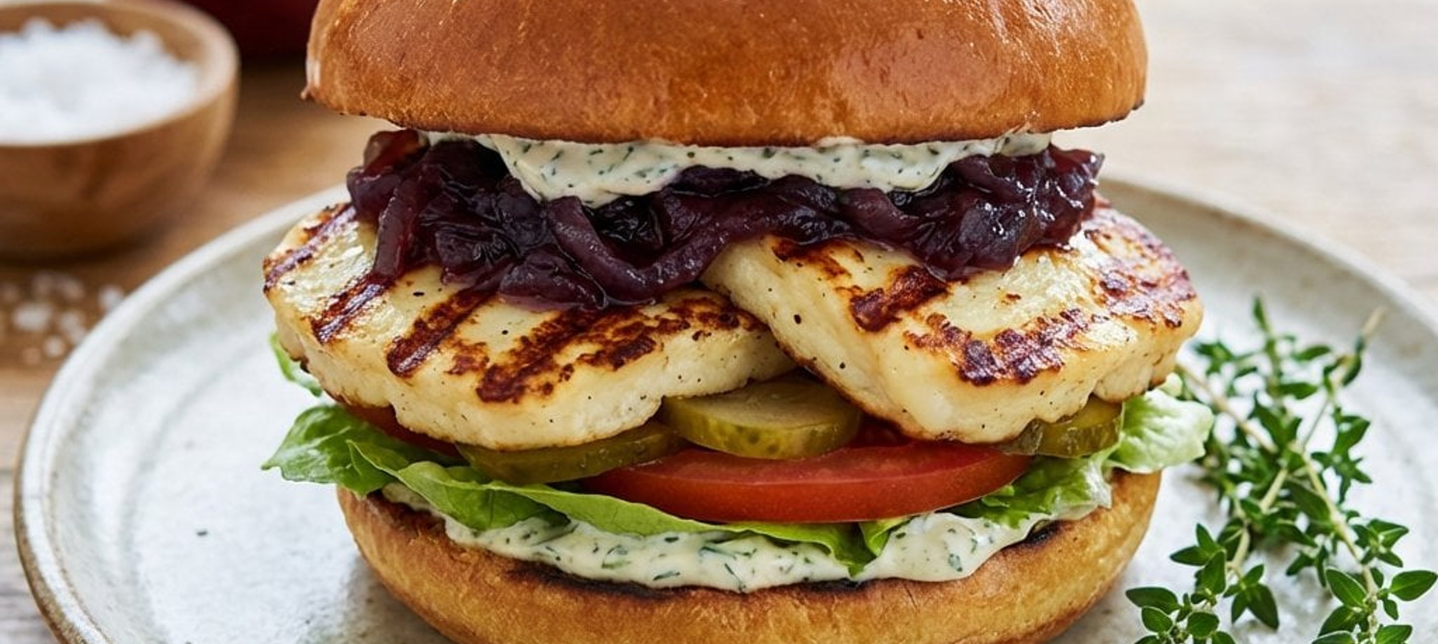 - 3A zsemle alját kenjük meg a dippel, tegyünk rá egy salátalevelet, helyezzük rá a grillezett halloumi sajtot, majd a paradicsomszeletet és a savanyú uborkát. Halmozzunk a tetejére a hagymalekvárból (chutney), végül a zsemle tetejét is kenjük meg dippel, és zárjuk le a burgert.