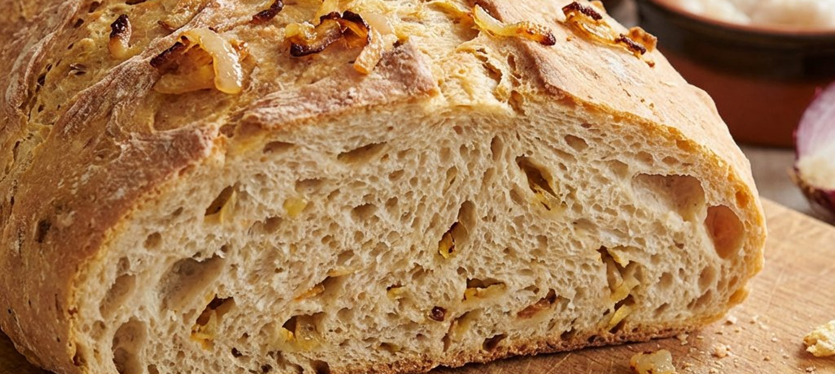 - 1A vöröshagymát vágjuk durvára. Egy serpenyőben, közepes lángon, gyakori kevergetés mellett pirítsuk aranybarnára a sertészsíron. A kész hagymát szedjük konyhai papírtörlőre, hogy a felesleges zsiradékot leitassuk róla. A kenyérhez összesen 250 g sült hagymára lesz szükségünk.