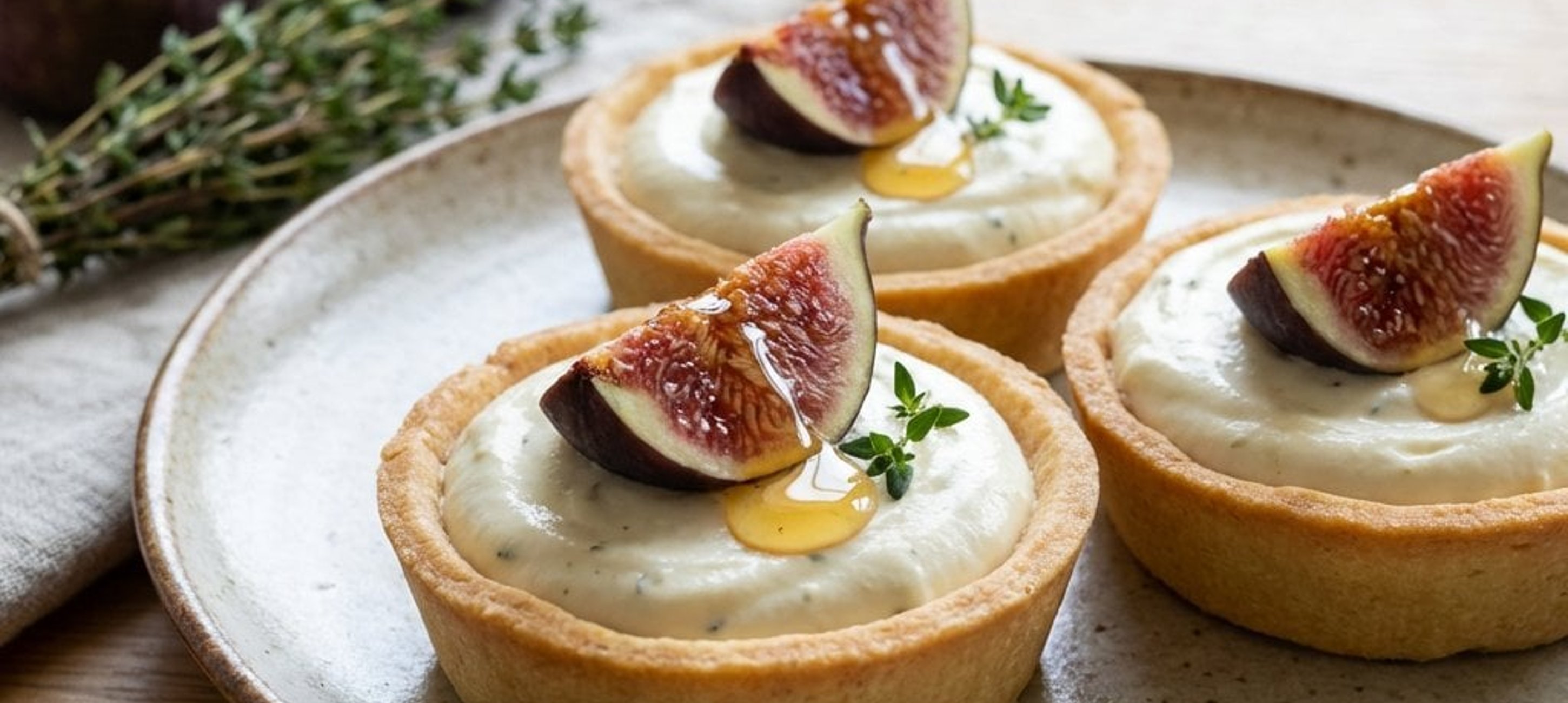 - 1Töltsük a krémet egy sima csöves habzsákba, és díszítsük fel a kosárkákat. Tegyük őket 15 percre a hűtőbe, hogy kissé megdermedjenek. A megmosott fügéket vágjuk nyolc részre. Minden kosárkára helyezzünk egy gerezd fügét, csorgassunk rá egy kevés mézet, és díszítsük egy kis ág kakukkfűvel.