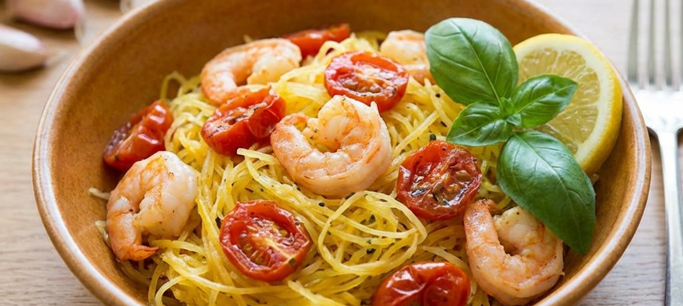 - 2A megmosott koktélparadicsomokat vágjuk félbe, a fokhagymát zúzzuk össze. Egy mélyebb serpenyőben hevítsünk olívaolajat, adjuk hozzá a fokhagymát and a megtisztított garnélákat. Rövid ideig pirítsuk, majd adjuk hozzá a paradicsomot, sót és borsot. Pirítsuk további 2 percig, végül forgassuk bele a spagetti tököt, és ízesítsük ízlés szerint.