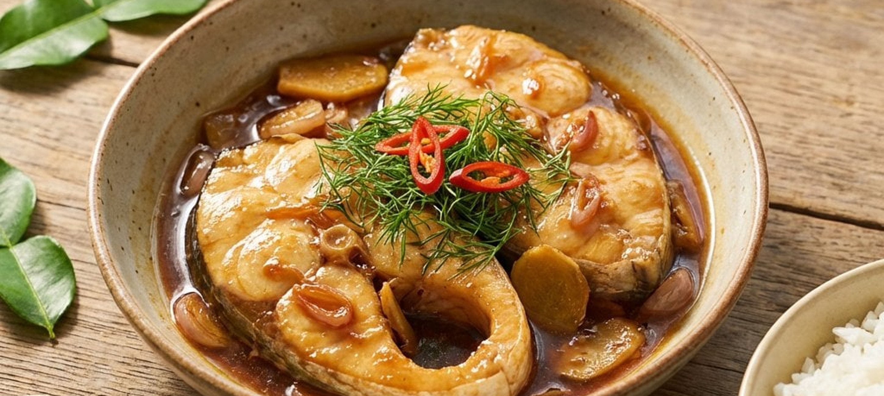 - 3Tegye a halat a lábasba, adja hozzá a salottahagymát, a gyömbért (vagy galangalt), a kaffir lime leveleket és a chilit. Öntse hozzá a halszószt, a karamellizált cukrot, majd öntse fel forró vízzel és fedje le. Főzze alacsony lángon kb. 30-40 percig, amíg a víz krémes mártássá redukálódik.