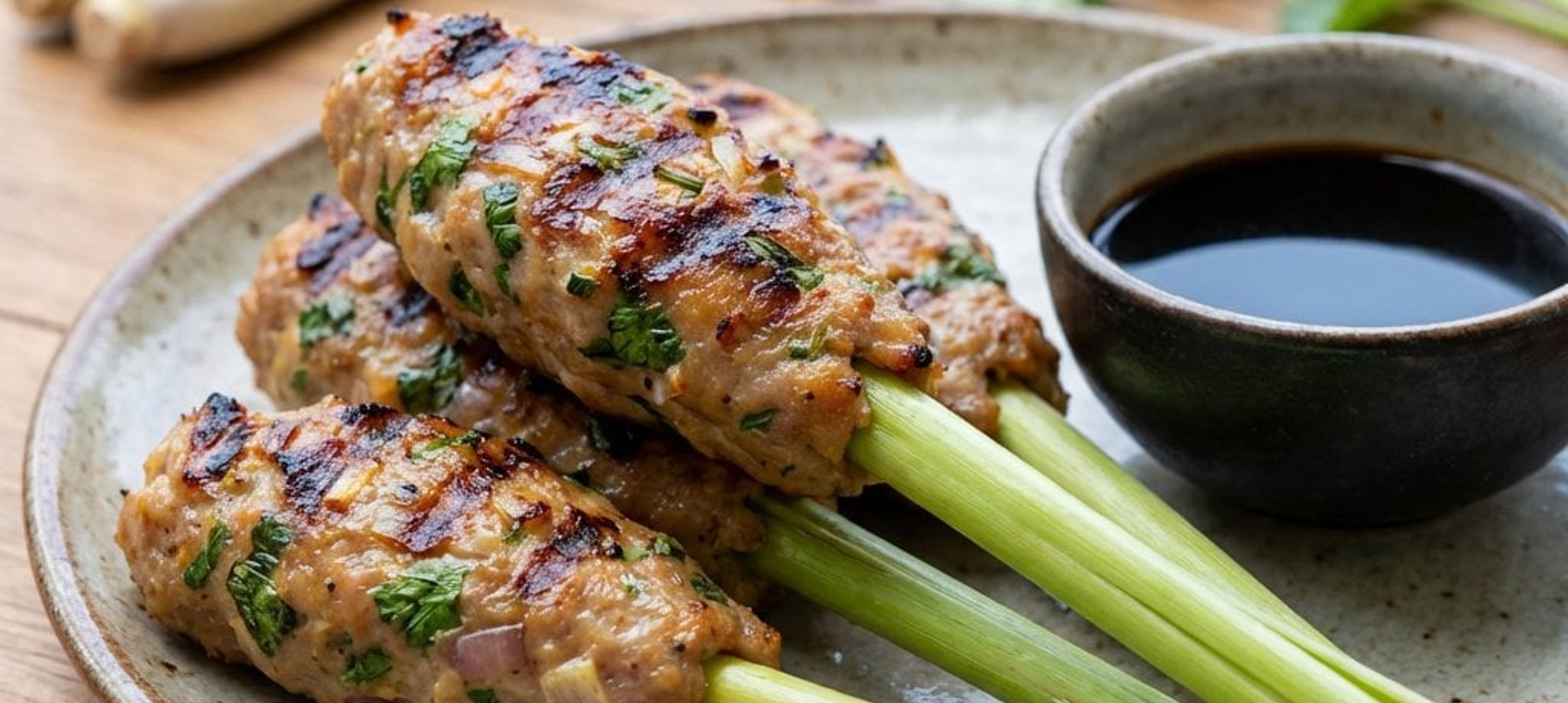 - 2A húsos masszát osszuk 10 egyenlő részre. A citromnád szárak alsó harmadát néhány helyen szurkáljuk meg késsel (hogy az aromák jobban felszabaduljanak), majd enyhén nedves kézzel formázzuk rá a fűszeres húst a szárakra, mintha kis nyársakat készítenénk.
