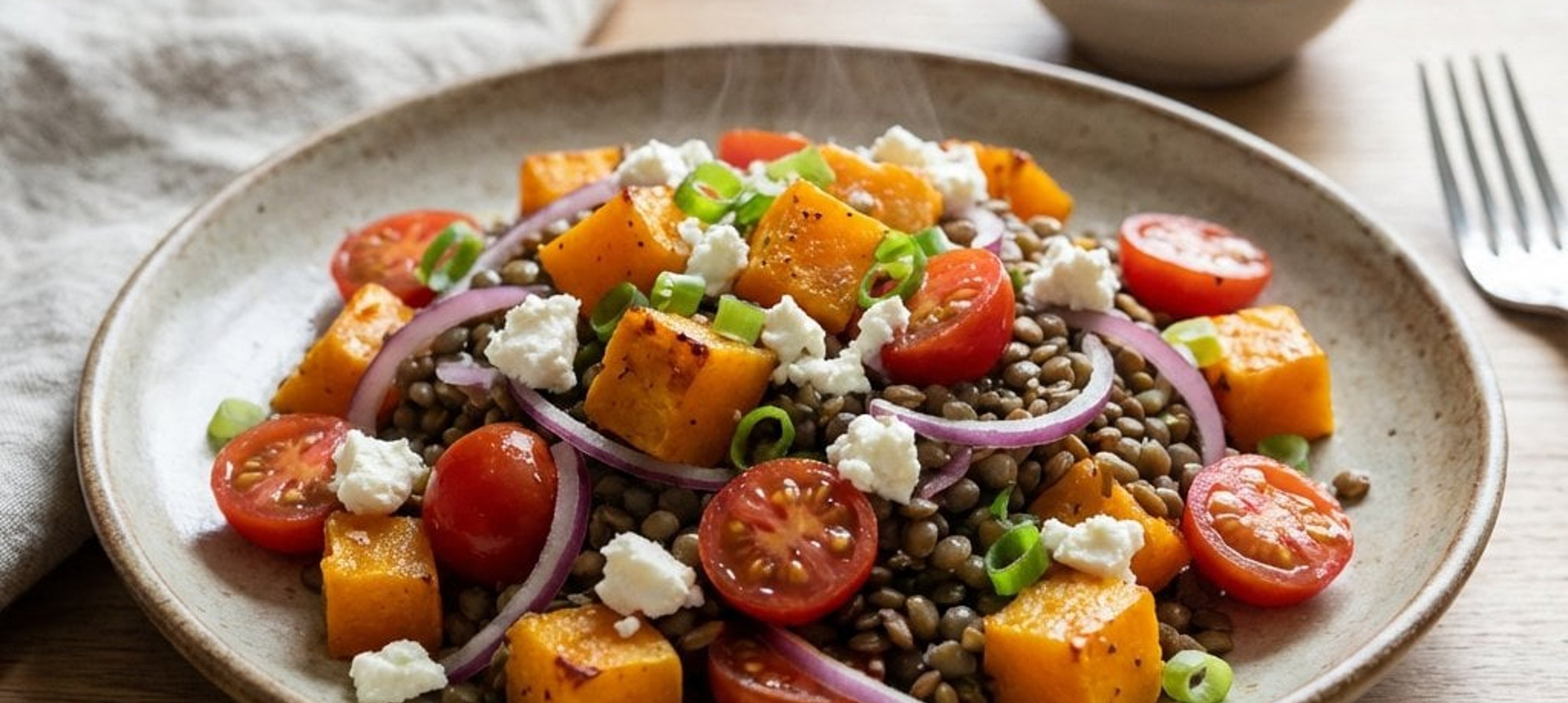 Tipp: A lencsét ne főzzük túl, maradjon enyhén roppanós, hogy jól illeszkedjen a sült sütőtök textúrájához.