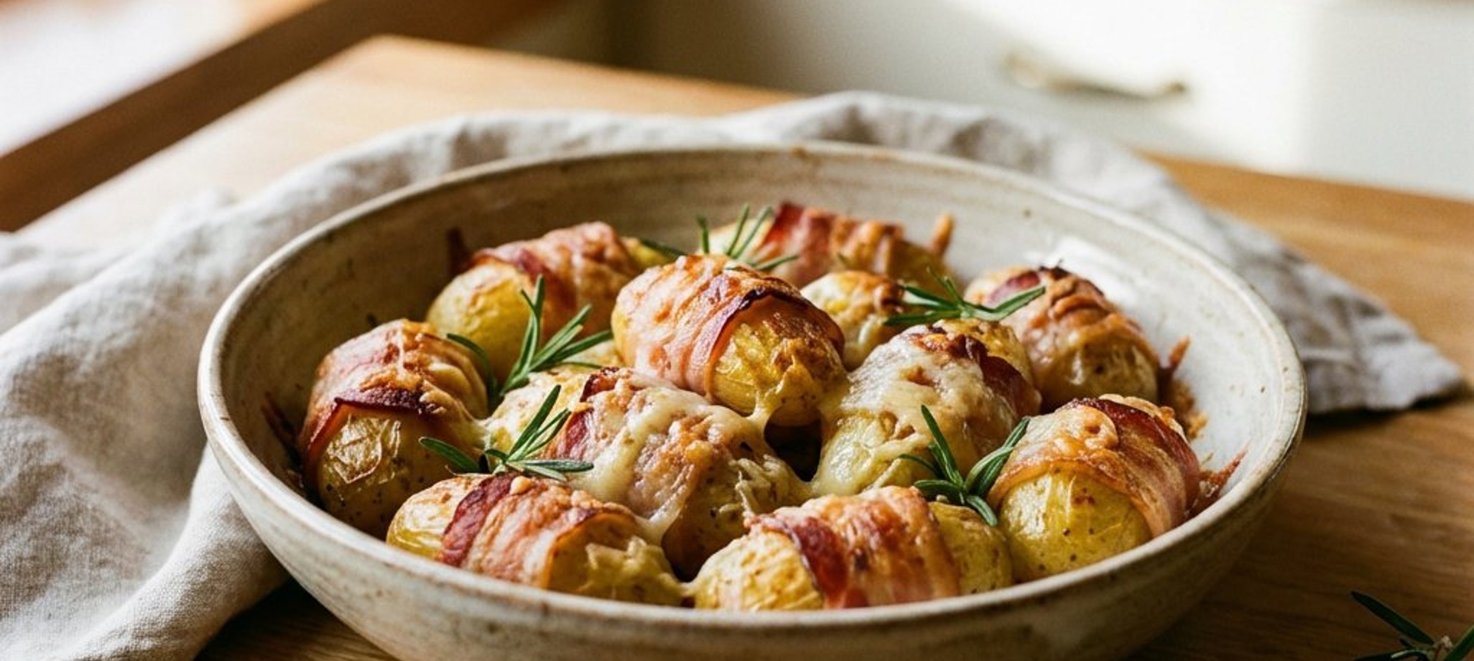 - 4Helyezzük a burgonyákat egy tepsibe (nem kell kikenni, a bacon elég zsiradékot enged majd). Süssük fedő nélkül kb. 15 percig, amíg a sajt megolvad, a bacon pedig aranybarna és ropogós lesz.
