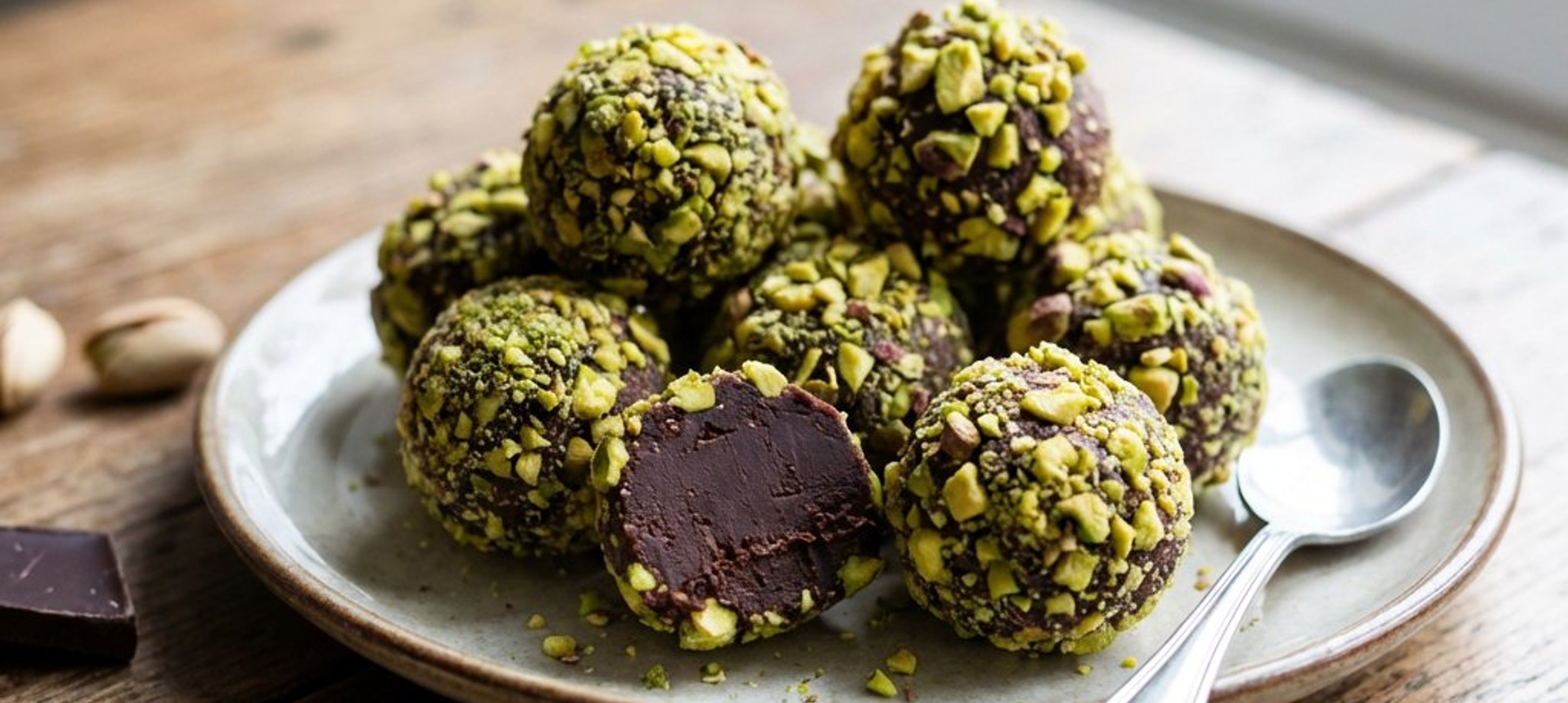 - 4A pisztáciát vágjuk apróra vagy daráljuk durvára. A megdermedt masszából teáskanállal szaggassunk darabokat, formázzunk belőlük golyókat, és azonnal forgassuk meg őket az aprított pisztáciában. Tipp: A golyókat könnyebb formázni, ha a tenyerünket előtte hideg vízzel enyhén megnedvesítjük.