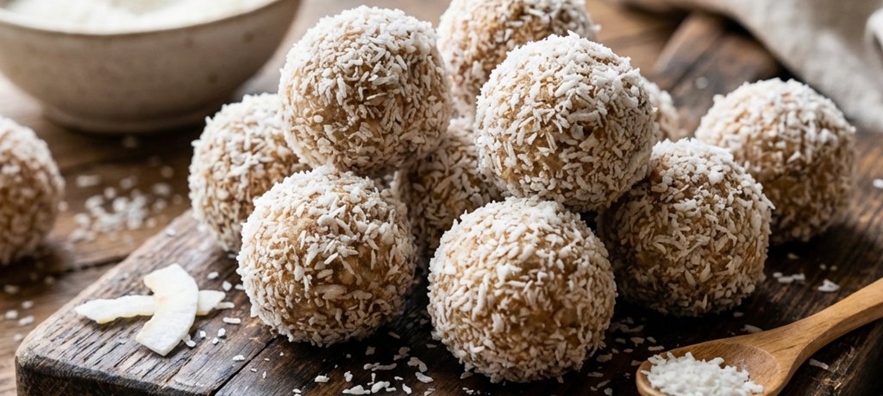 - 3A hűtőből kivéve ellenőrizd az állagot. Ha túl lágy, adj hozzá még egy kevés kókuszreszeléket, amíg jól formázható nem lesz. Formázz a masszából kis golyókat a tenyereddel.