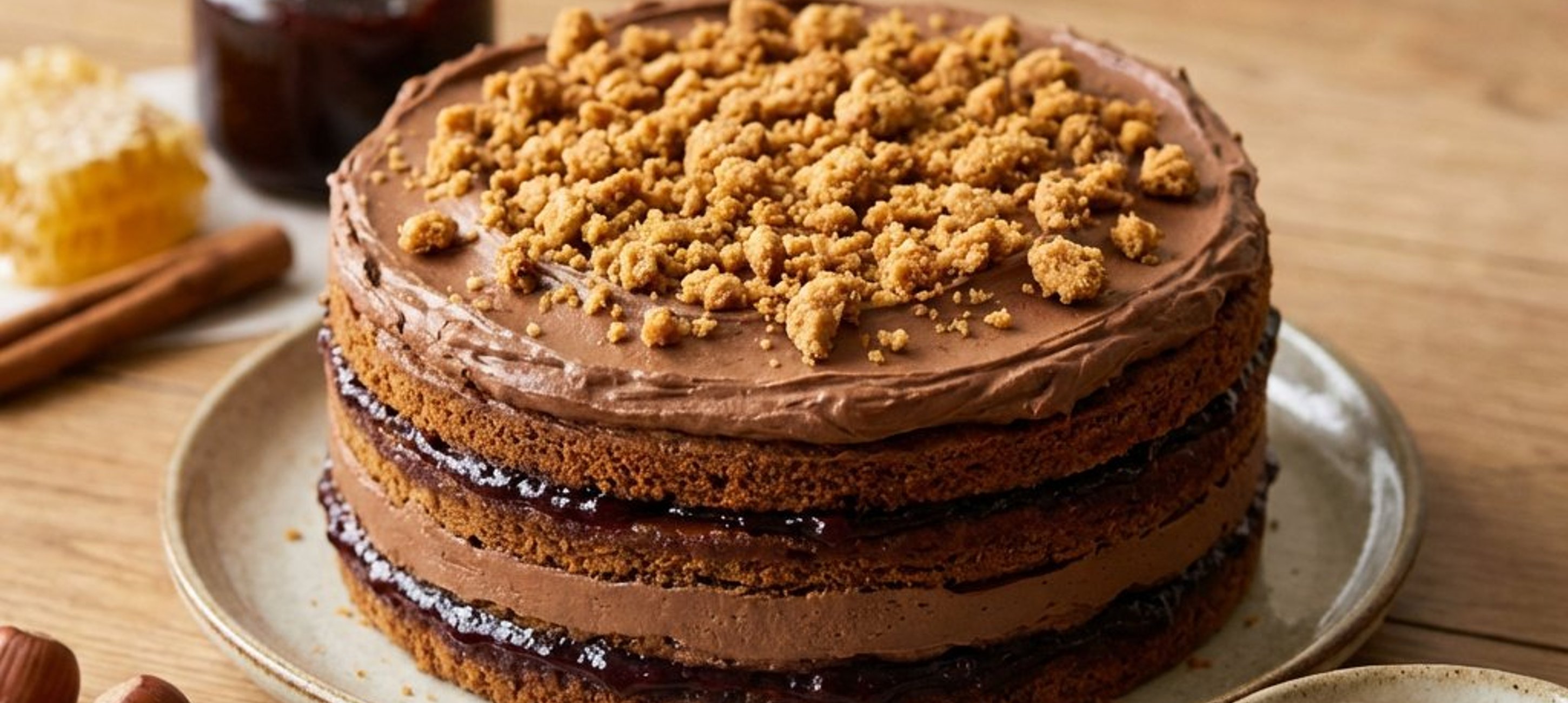 - 3A legfelső lapot és a torta oldalát vonjuk be a maradék csokoládékrémmel. Az oldalát panírozzuk be a tésztamorzsával. A tetejét díszíthetjük a maradék mogyoróval vagy tésztából készült kekszekkel.