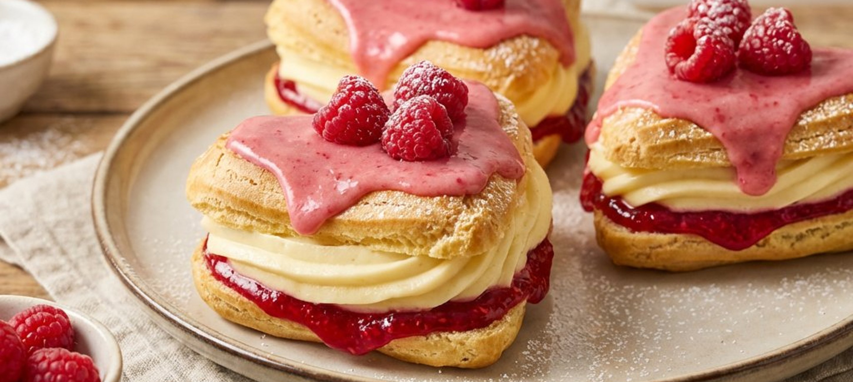 Tipp: A tészta szíveket érdemes a tálalás napján megtölteni, hogy a tészta ropogós maradjon. A málnazselét és a vaníliapuding alapot akár előző nap is elkészítheti.