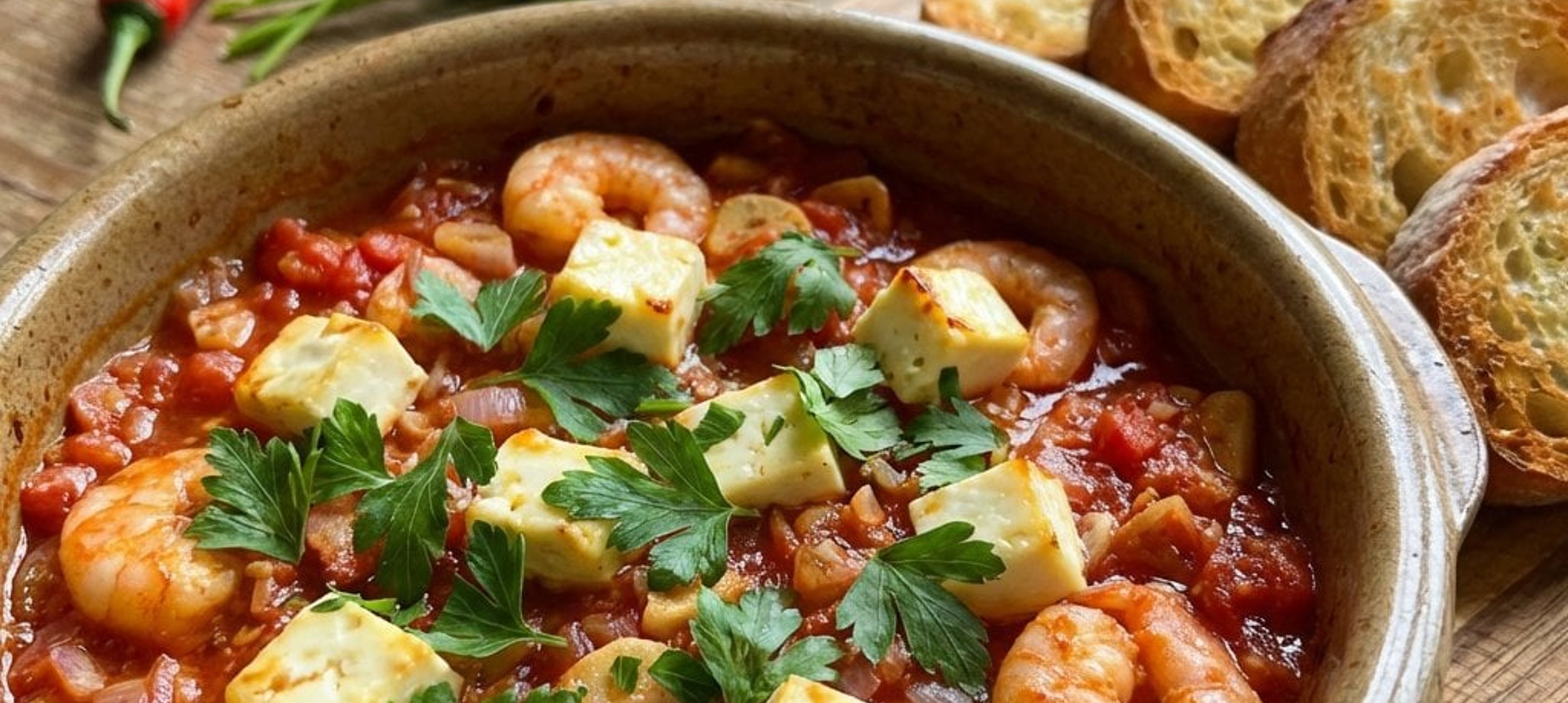 - 2Közben kockázzuk fel a feta sajtot és aprítsuk fel a petrezselymet. A garnélákat sózzuk, borsozzuk, majd keverjük a paradicsomos mártáshoz a petrezselyemmel és a feta kockákkal együtt. Öntsük a keveréket egy tűzálló tálba, és süssük a sütőben 20 percig. Az utolsó pár percre tegyük mellé a bagettet is, hogy ropogósra süljön. Melegen, a bagettel tálaljuk.