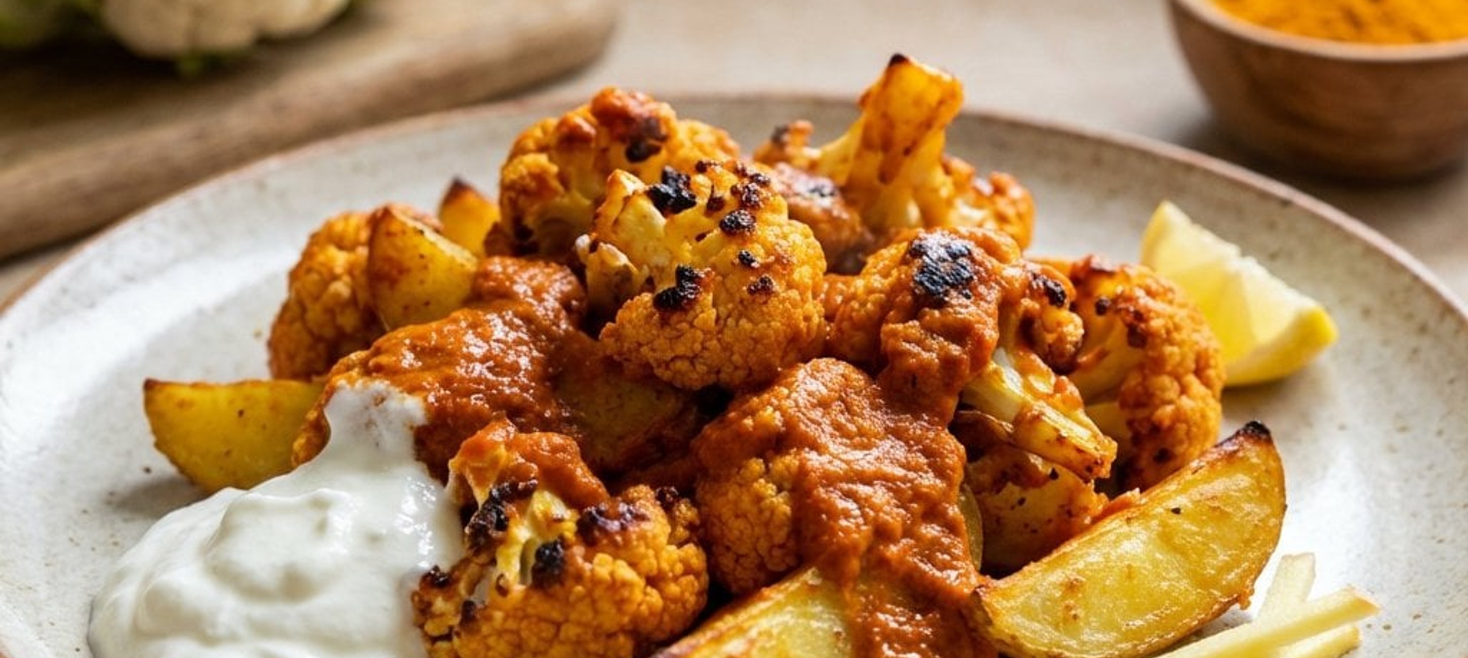 - 6Amint a karfiol és a burgonya megpuhult, helyezzük őket a tepsiben lévő paradicsomszószra, majd vonjuk be őket a 4. pontban elkészített joghurtos tandoori masalával.