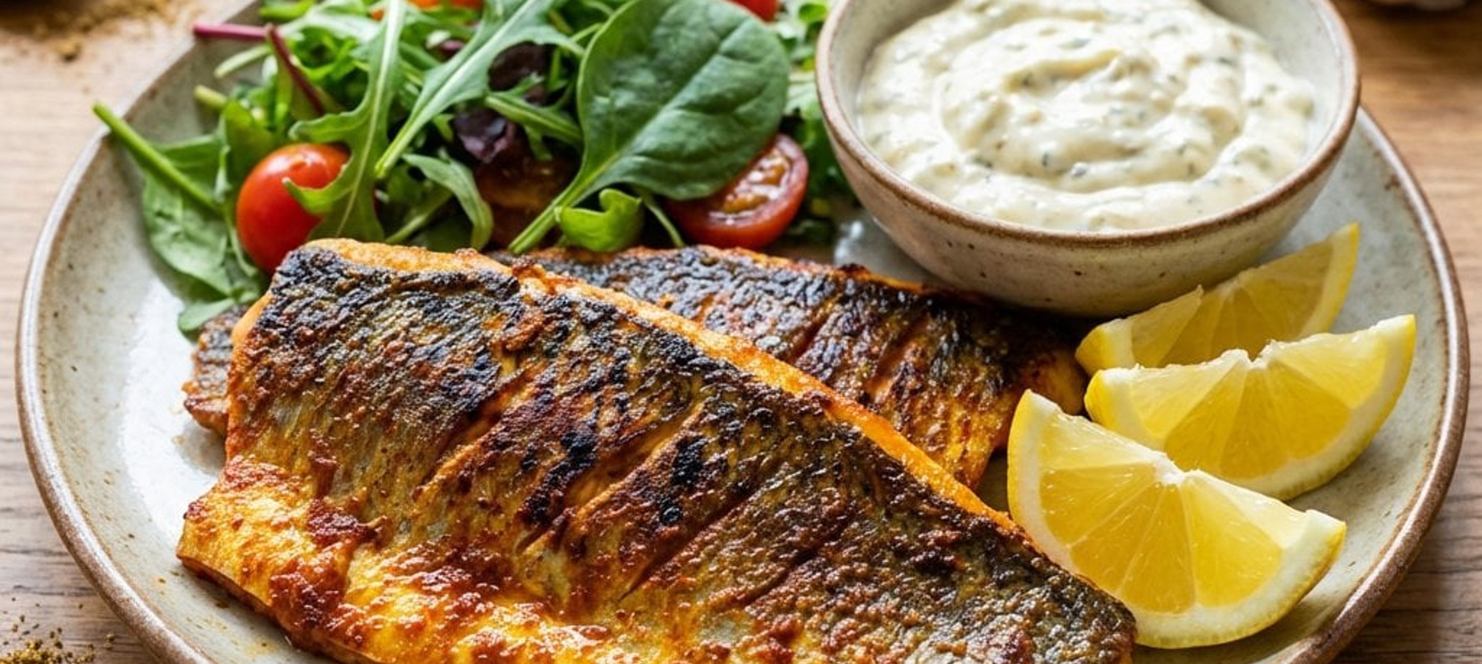 - 5Tálaljuk a sült halat tartármártással, citromgerezdekkel és friss vegyes salátával.