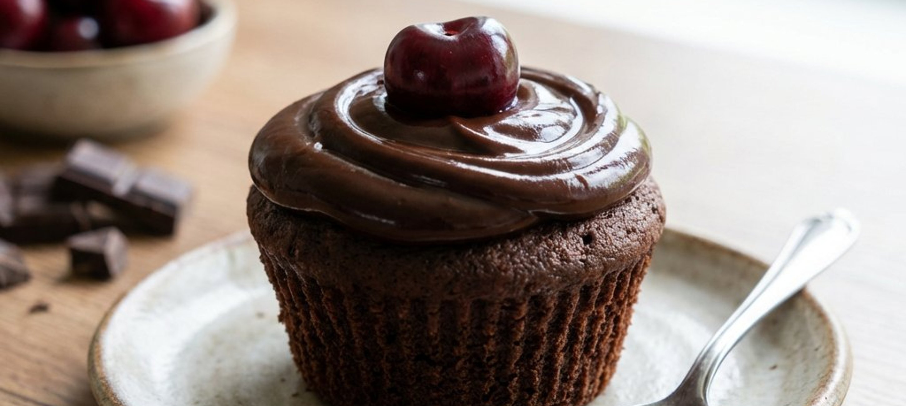 - 6Az aprított csokoládét (50 g) forgassuk a tésztába, majd osszuk el a masszát a kosárkákban (ne töltsük teljesen tele, hagyjunk kb. 1 cm-t a peremig). Minden muffinba nyomkodjunk néhány szem meggyet.