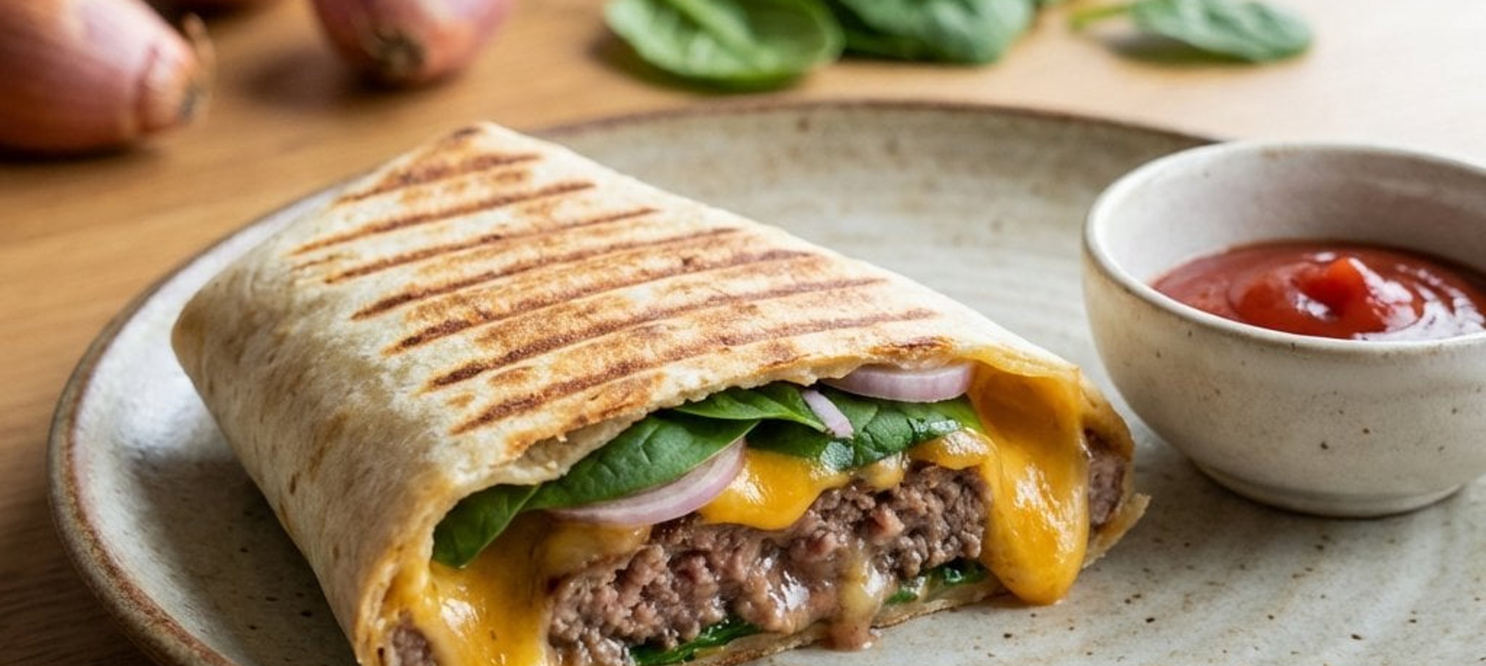 - 5Most hajtsd össze a wrapet: először hajtsd a húsos részt a sajtra, majd ezt a kettőt a salátás részre, végül az egészet hajtsd rá a ketchuppal megkent negyedre.