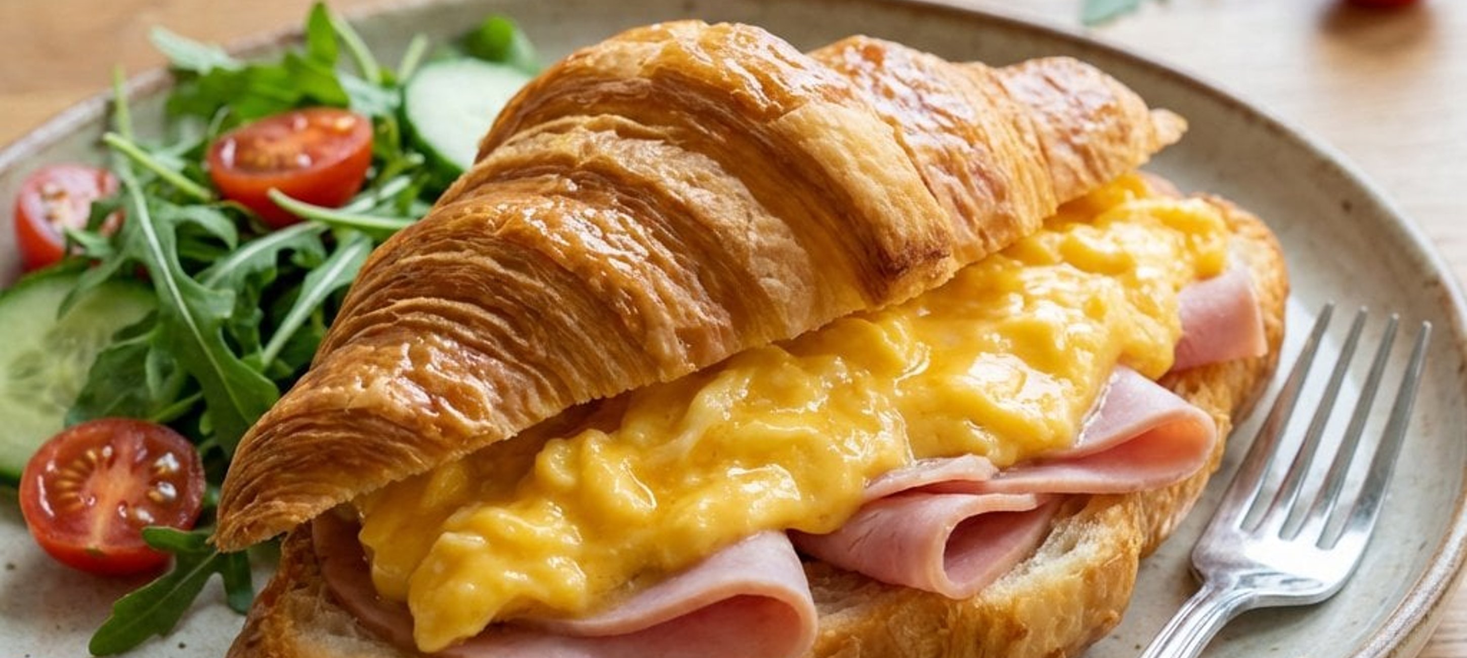 - 1A croissant-okat vágja félbe hosszában (de ne vágja át teljesen, hagyja egyben az egyik oldalon, így könnyebb lesz tölteni és enni is). Helyezzen mindegyikbe két szelet sonkát, majd halmozza rá az elkészített krémes rántottát. Kínálja a friss rukkola salátával.