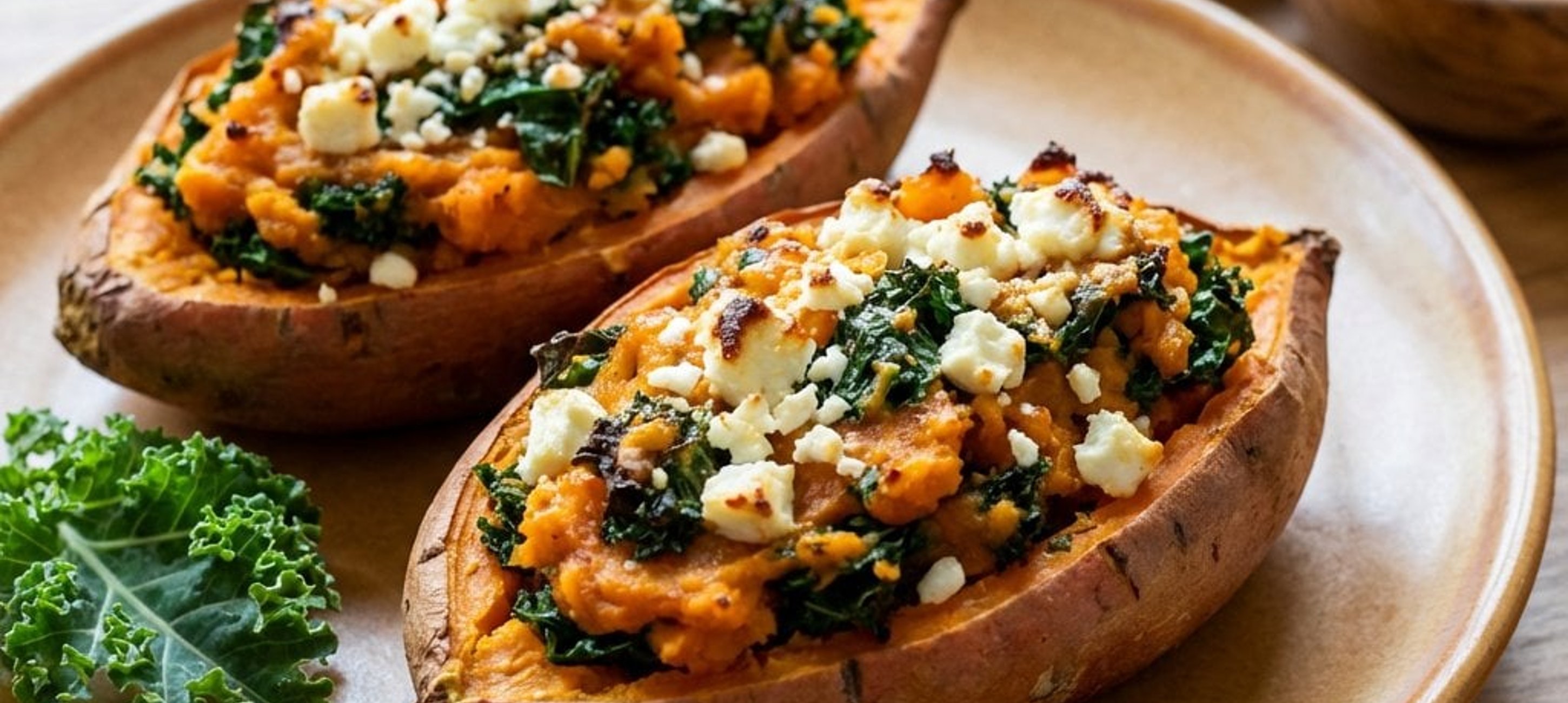 - 3A megsült édesburgonyákat vedd ki a sütőből, és mindegyiket vágd be hosszában a tetején, hogy könnyen ki tudd vájni a belsejét. A kikapart burgonyahúst add a fetás-fodros keles keverékhez. Sózd, borsozd ízlés szerint, majd alaposan keverd össze.