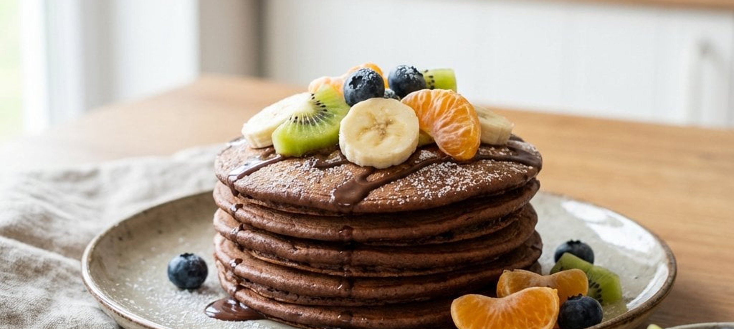 - 7A kész palacsintákat tálalja a felszeletelt banánnal, kivivel, mandarinnal és friss áfonyával díszítve. Akár játékos formákat is kirakhat belőlük a gyerekeknek!