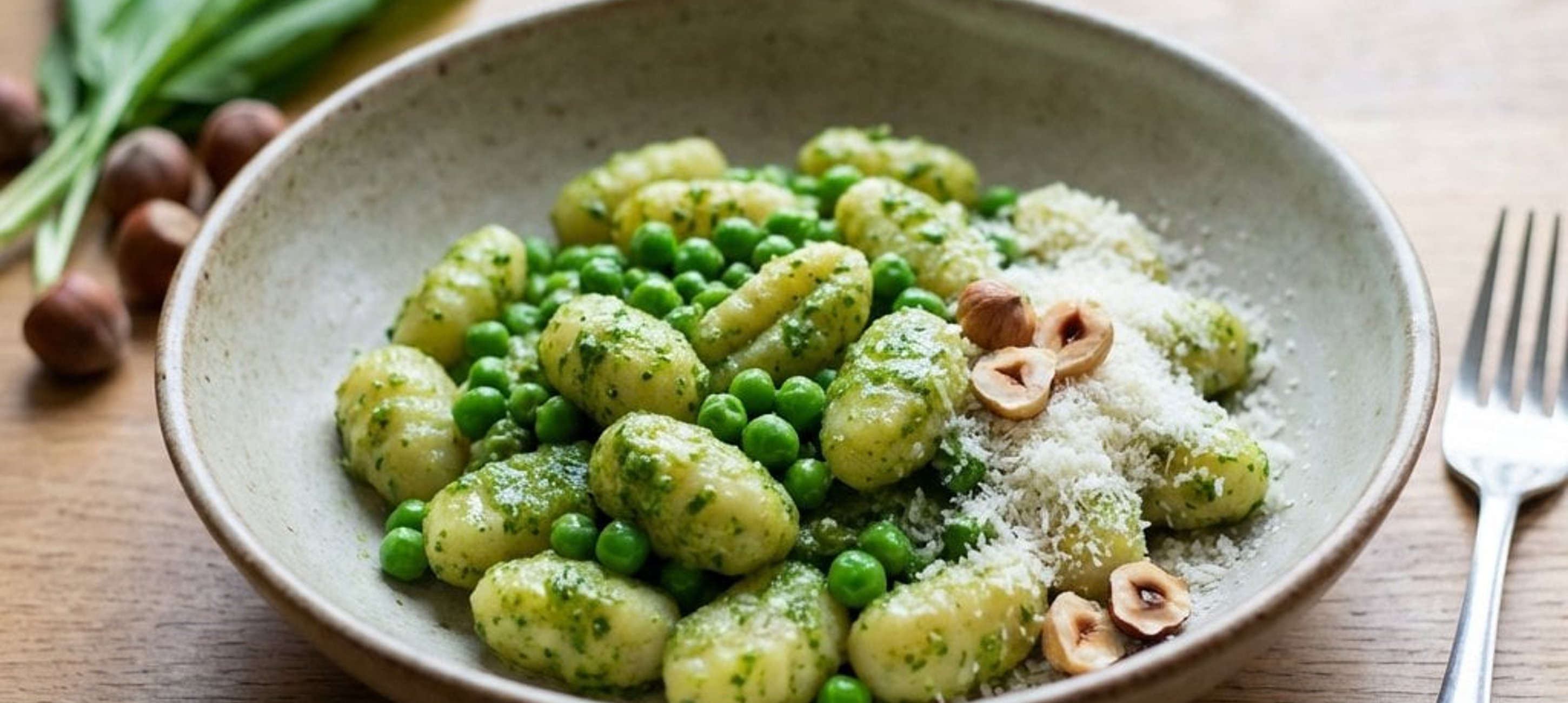 - 1Egy serpenyőben, egy kevés olívaolajon kb. 5 perc alatt hirtelen pirítsuk meg a fagyasztott zöldborsót. Sózzuk és borsozzuk. A gnocchit főzzük ki a csomagoláson található utasítás szerint (a főzési idő attól függ, hogy friss vagy száraz tésztát használunk). A kifőtt gnocchit keverjük össze 4 evőkanál pesztóval és a pirított zöldborsóval. Tálaláskor szórjuk meg reszelt Pecorino sajttal.