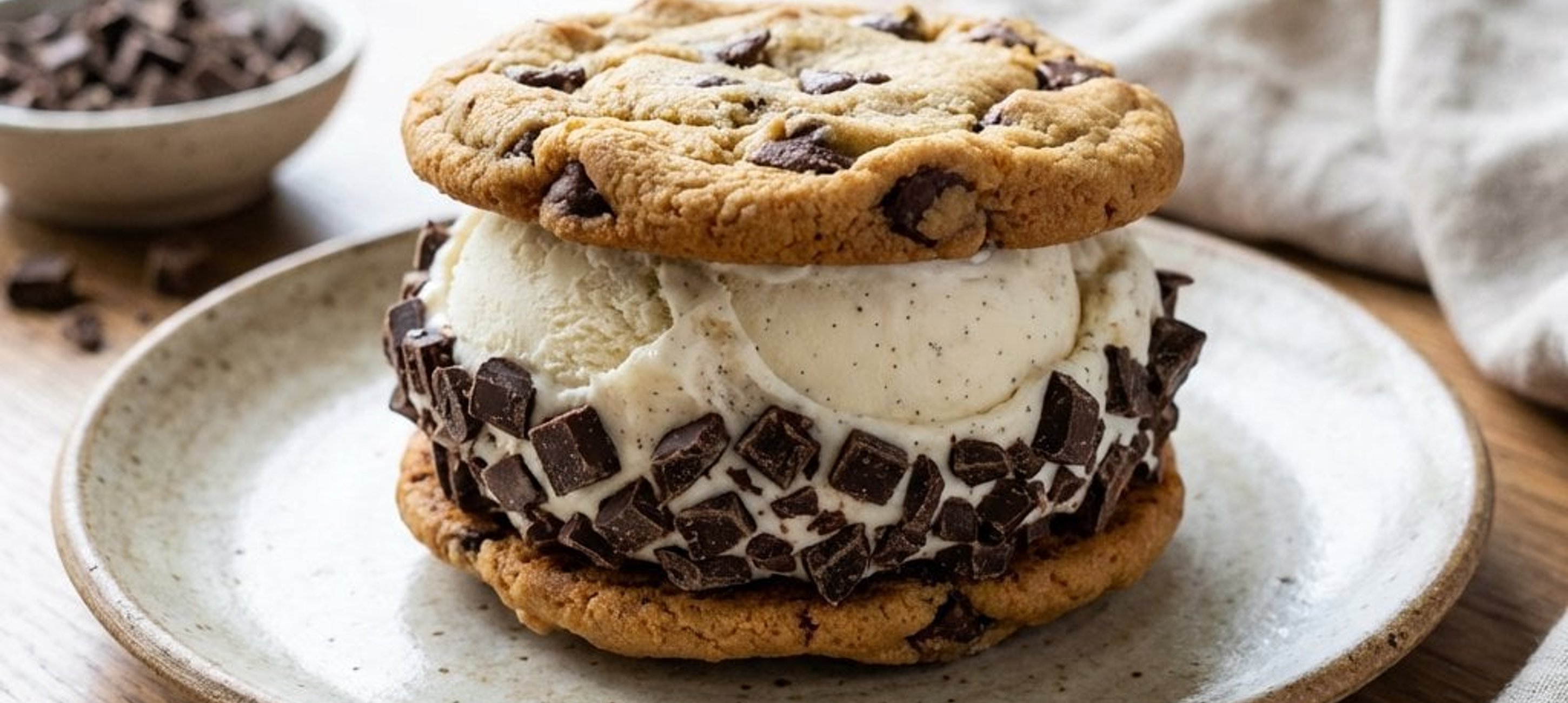- 3A szendvics oldalait, ahol a fagylalt kilátszik, simítsuk el egy kanállal, majd forgassuk bele az aprított étcsokoládéba. Azonnal tálaljuk, vagy tegyük a fagyasztóba rövid időre.