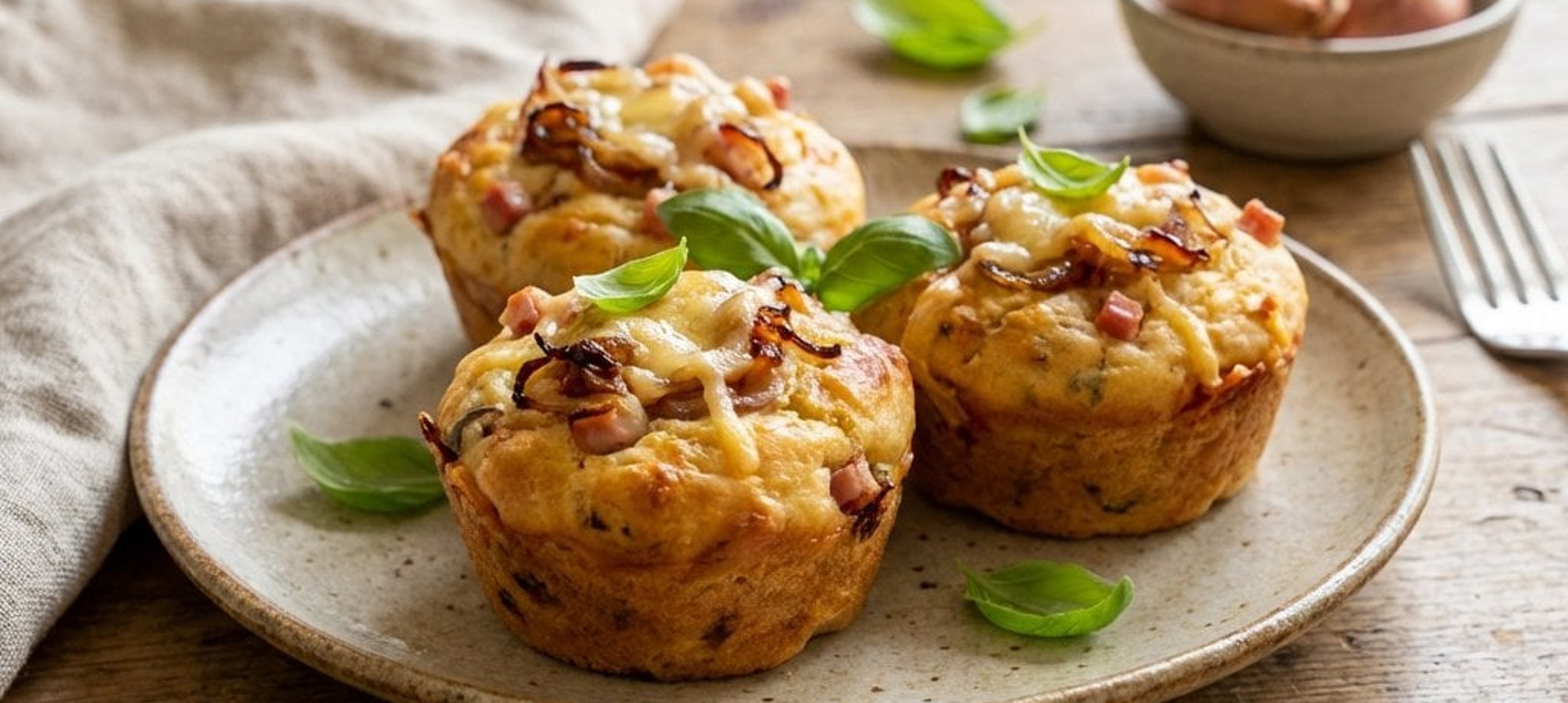 - 3A muffinformákat béleljük ki papírkosárkákkal, töltsük meg őket 3/4-ig a tésztával, a tetejüket pedig szórjuk meg a karamellizált mogyoróhagymás sonkával. Süssük a sütőben 35-40 percig. Tűpróbával ellenőrizzük, hogy átsült-e a tészta.