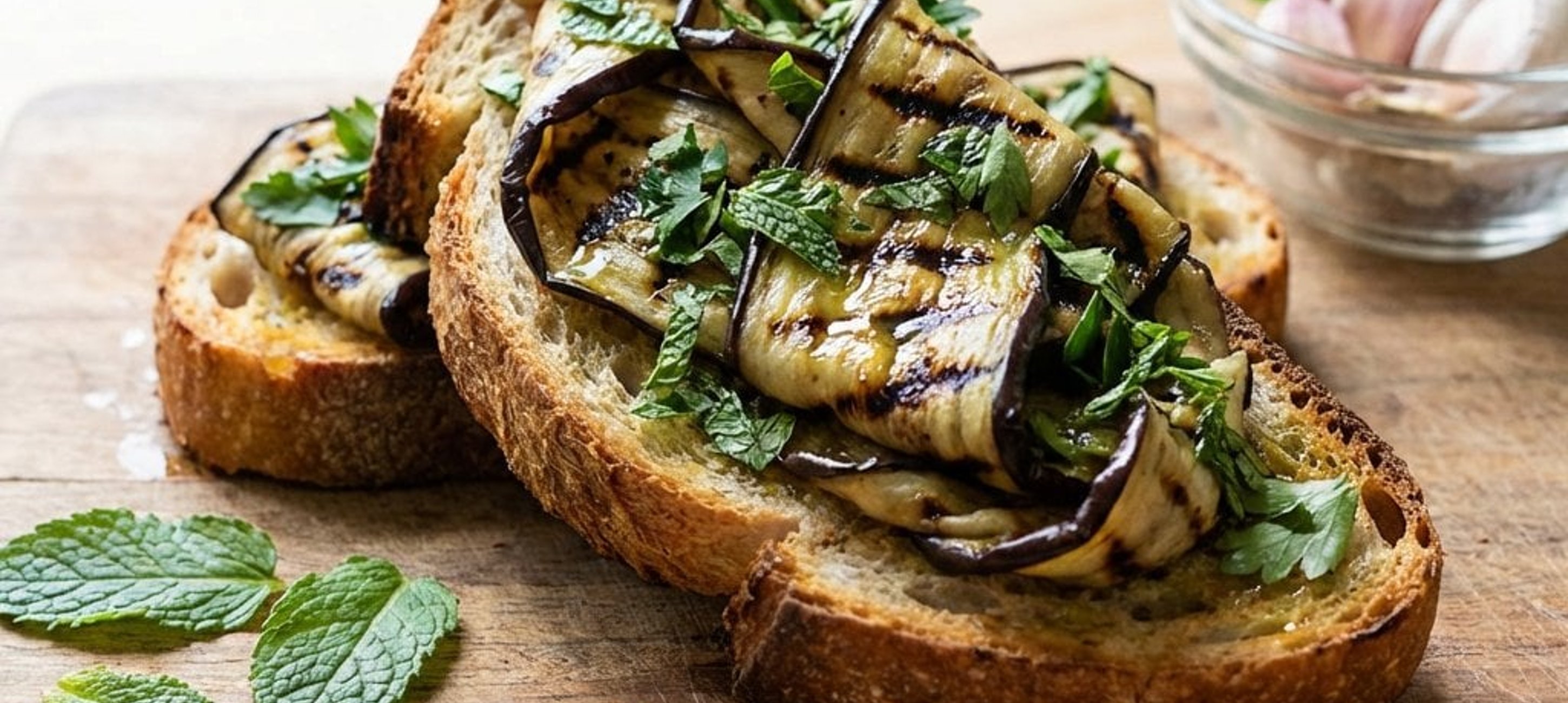 - 3A kenyérszeleteket vágjuk félbe, és pirítsuk ropogósra sütőben, kenyérpirítóban vagy grillen. A megpirult kenyereket dörzsöljük be a másik gerezd fokhagymával, és csepegtessünk rájuk kevés olívaolajat. Tálaljuk a fűszeres padlizsánkrémmel a tetején.