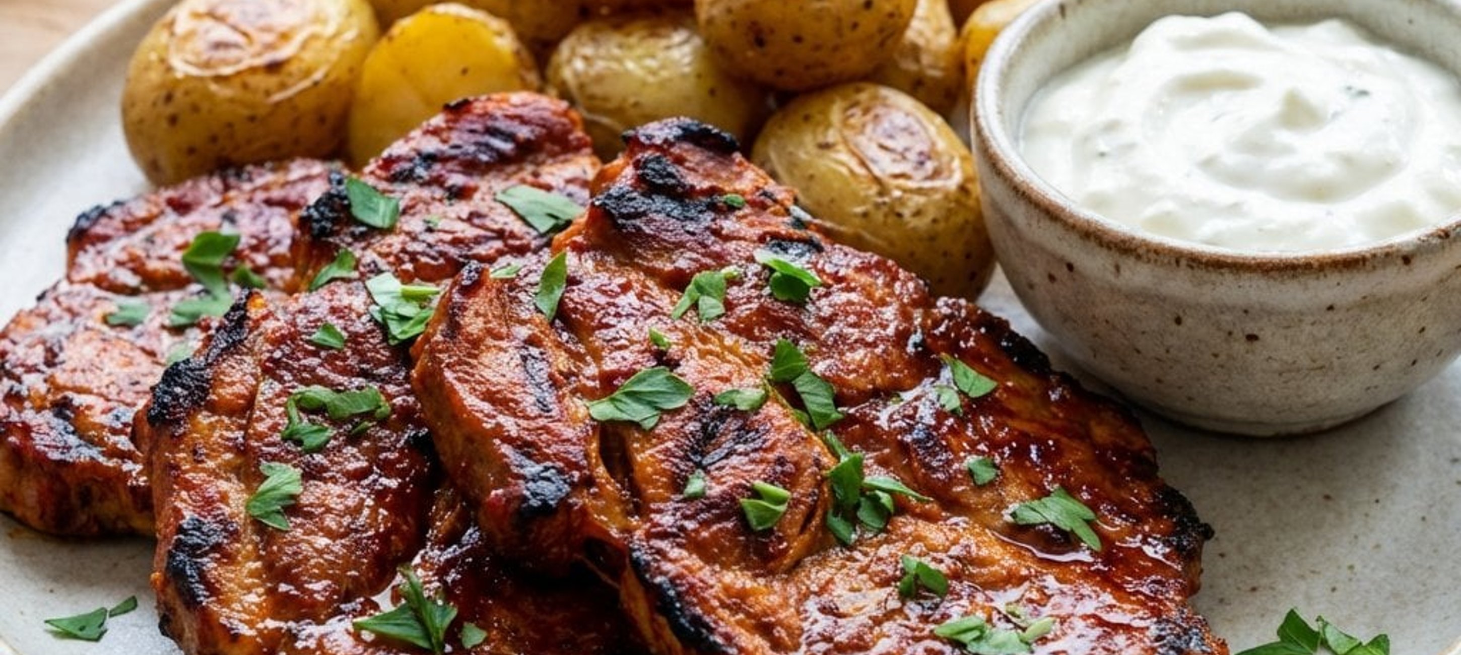 - 2Közben készítse el a mártogatóst: keverje össze a tejfölt, a majonézt és a zúzott fokhagymát. Amint a tarja megpuhult, vegye le a grillről és sózza meg. Vegye ki az alufóliás burgonyát is. Tálalja a húst a sült burgonyával, szórja meg friss petrezselyemmel, és kínálja a fokhagymás mártogatóssal.