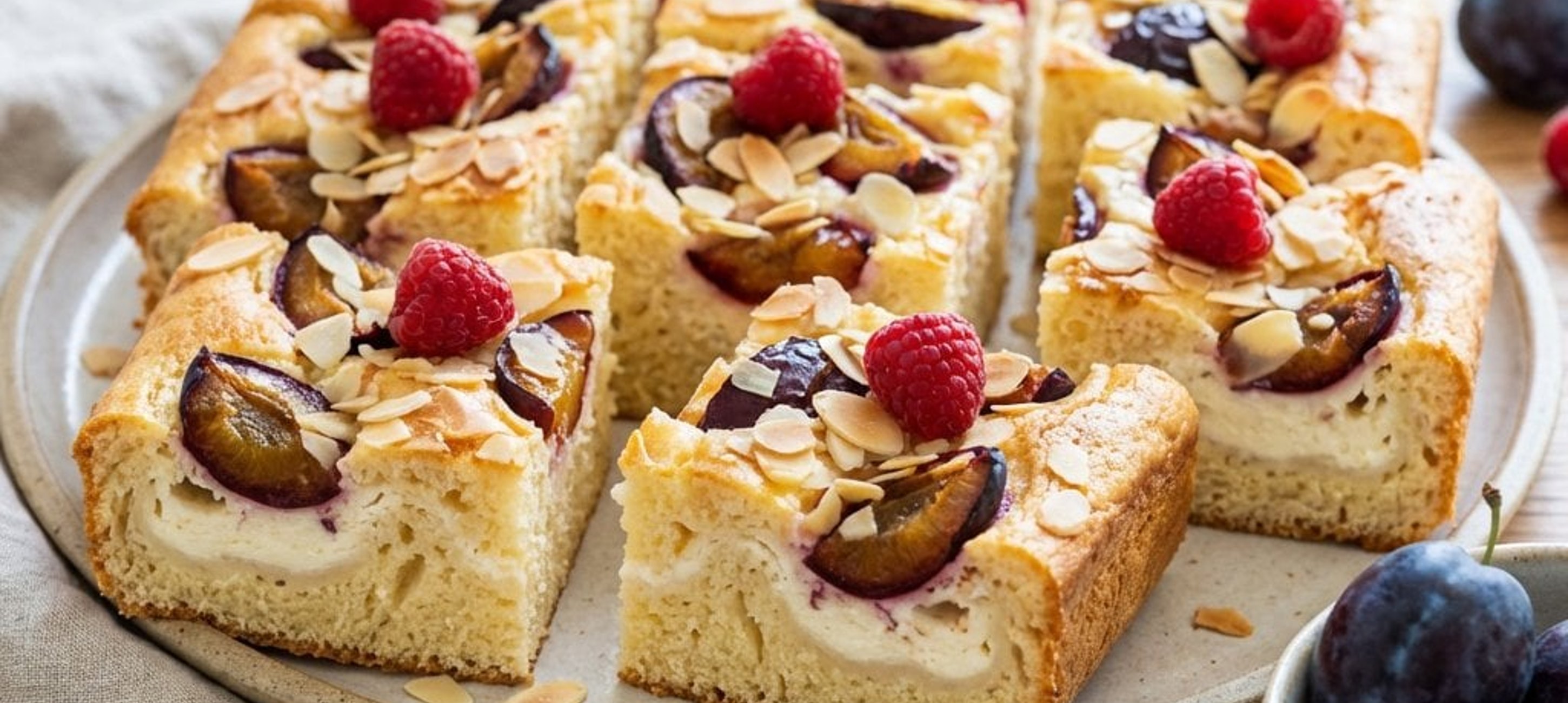 - 5Rakjuk ki a sütemény tetejét a megtisztított, szükség esetén darabolt gyümölcsökkel, majd szórjuk meg a vaníliás cukorral és a szeletelt mandulával.