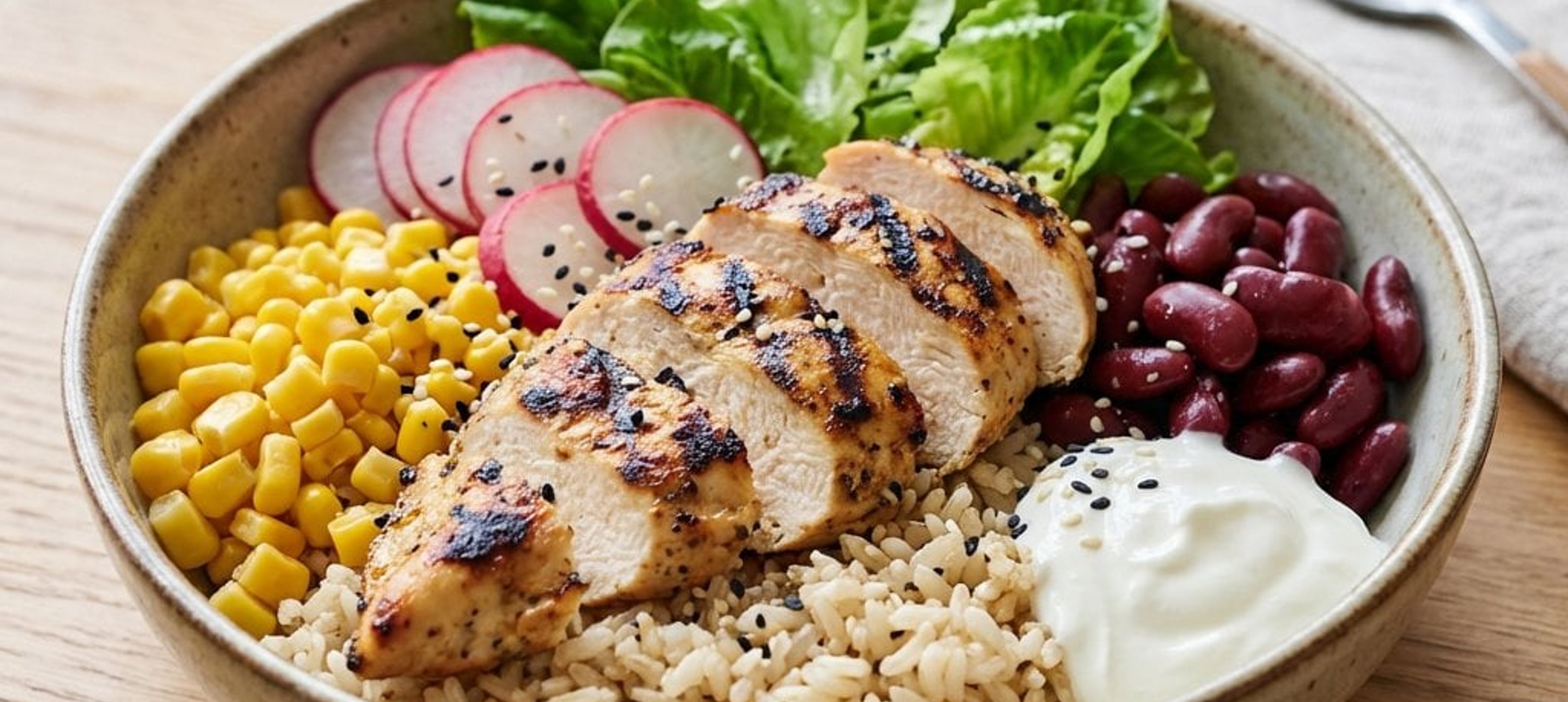 - 3Egy mélyebb tálba vagy bowlba halmozzuk bele a friss salátaleveleket és a főtt rizst. Adjuk hozzá a kukoricát, a leöblített vörösbabot, a felkarikázott retket és a sült csirkeszeleteket.