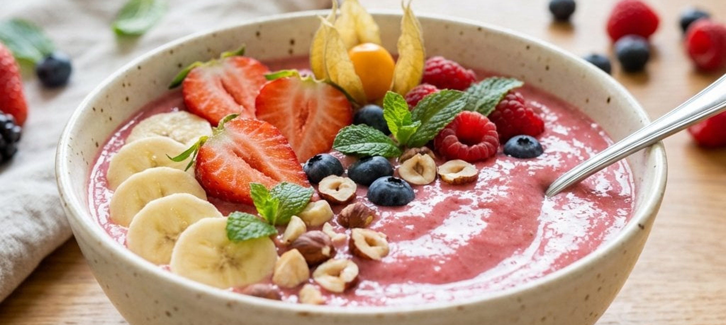 - 3Öntsük a smoothie-t tálakba, és díszítsük a maradék friss banánkarikákkal, fizálisszal, málnával, áfonyával, durvára vágott mogyoróval, pisztáciával és friss mentalevelekkel.