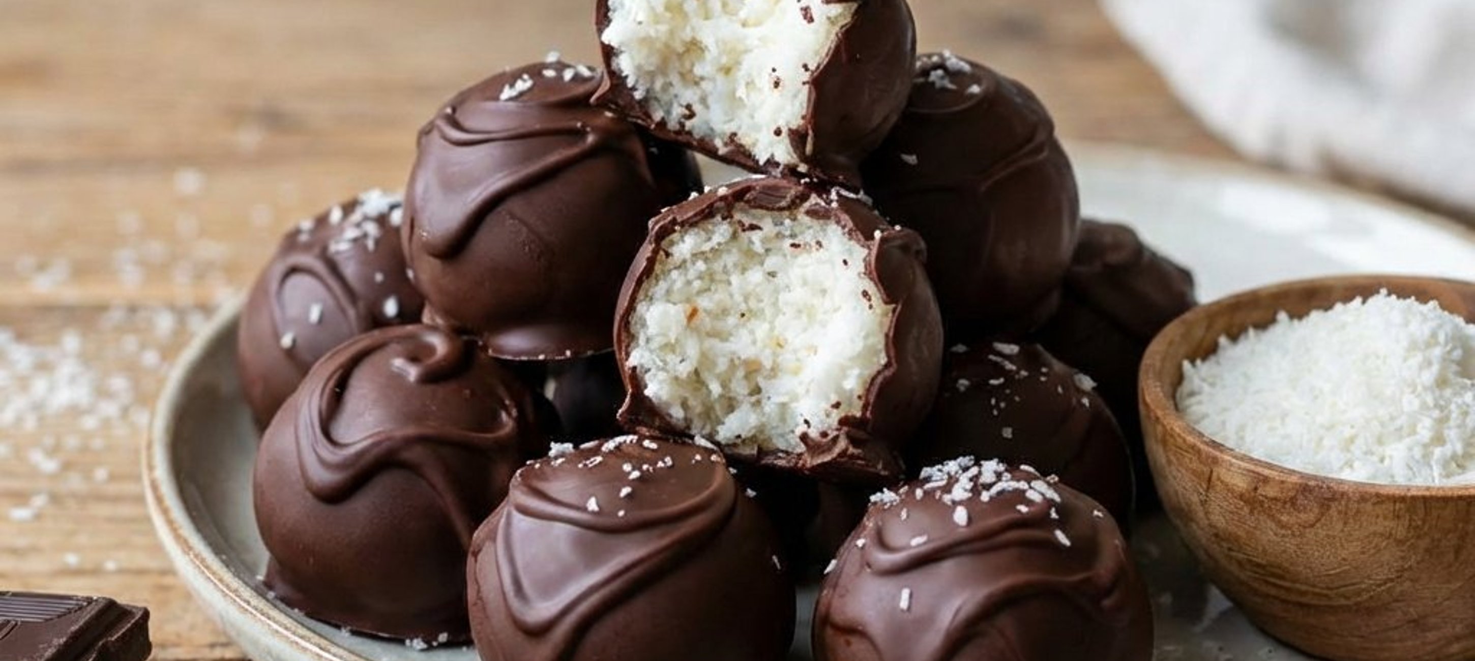 Tipp: A golyókat díszítheted a tetejükre szórt extra kókuszreszelékkel is, mielőtt a csokoládé teljesen megdermedne.