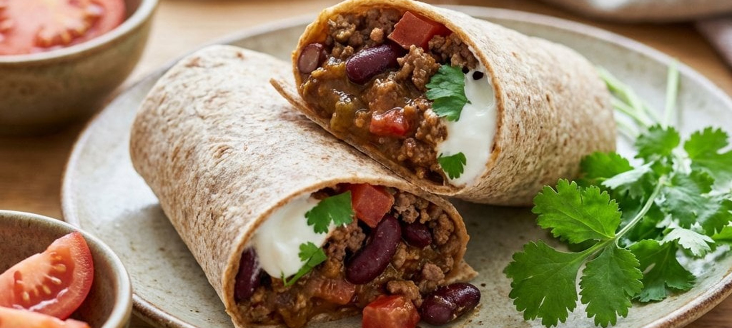- 4A felmelegített tortilla közepére halmozza a húsos ragut, a friss paradicsomot, a salátát, a koriandert és a görög joghurtot, hagyva kb. 3 cm-t a széleitől. Hajtsa be a két oldalsó szélét a közép felé, majd az Önhöz közelebb eső széltől kezdve szorosan tekerje fel a burritót. Végül csomagolja alufóliába a kész burritót.