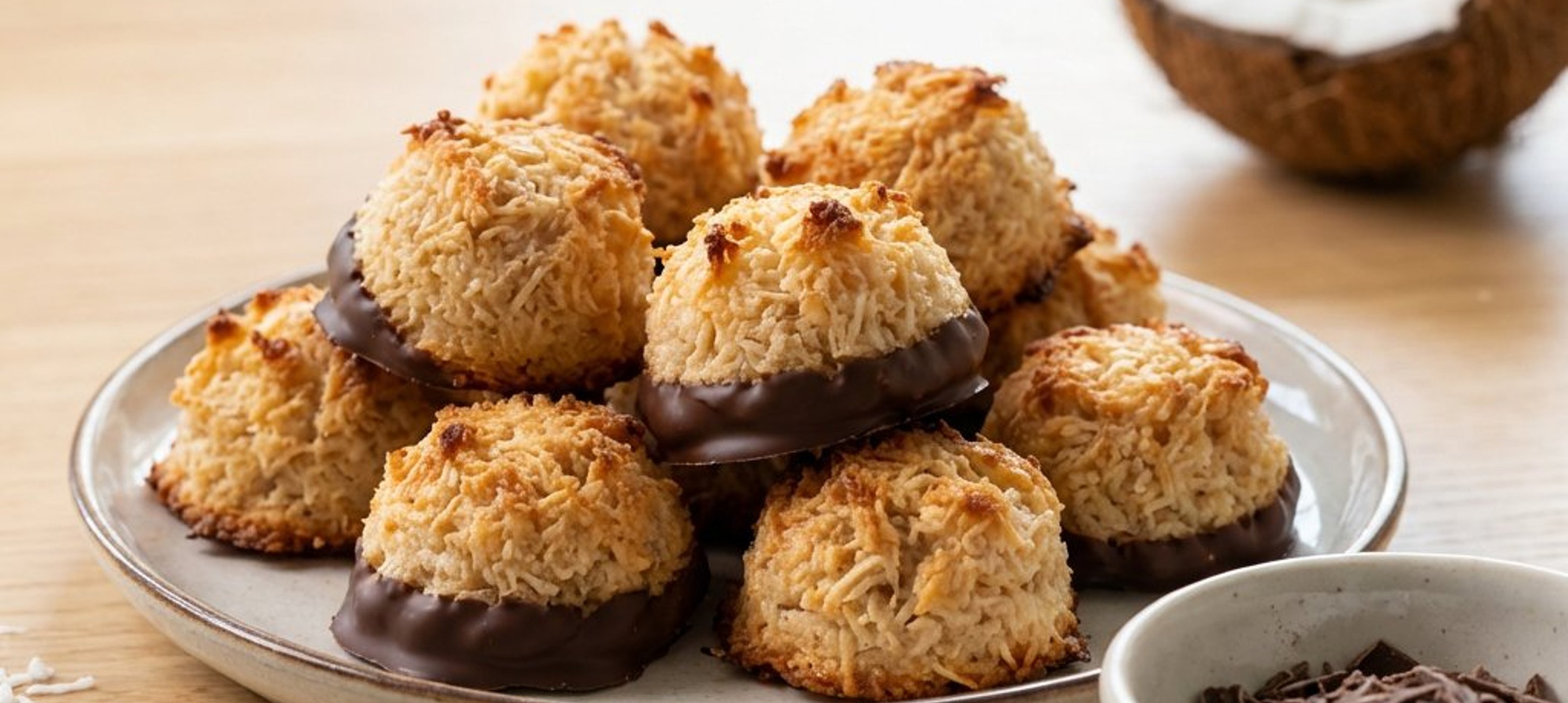 A kókuszos csókokat tálalás előtt mártsd jó minőségű olvasztott étcsokoládéba, majd hagyd megdermedni.