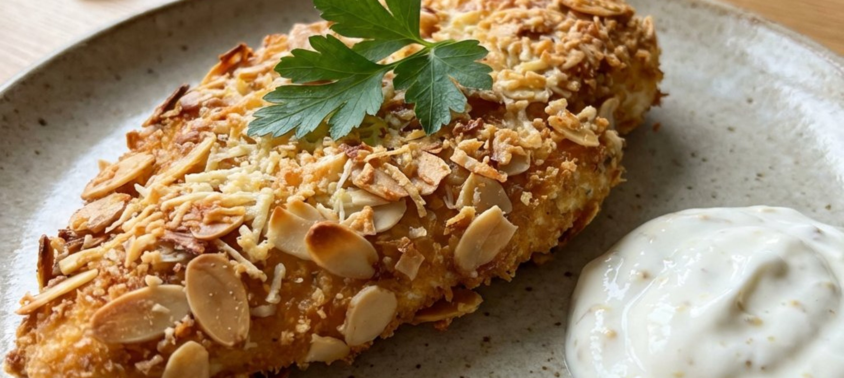 - 4A csirkemelleket először mindkét oldalukon alaposan forgassuk meg a joghurtos keverékben, majd panírozzuk be a mandulás-halloumi keverékkel. A bebundázott szeleteket helyezzük az előkészített tepsire. Folytassuk, amíg az összes hús el nem fogy.