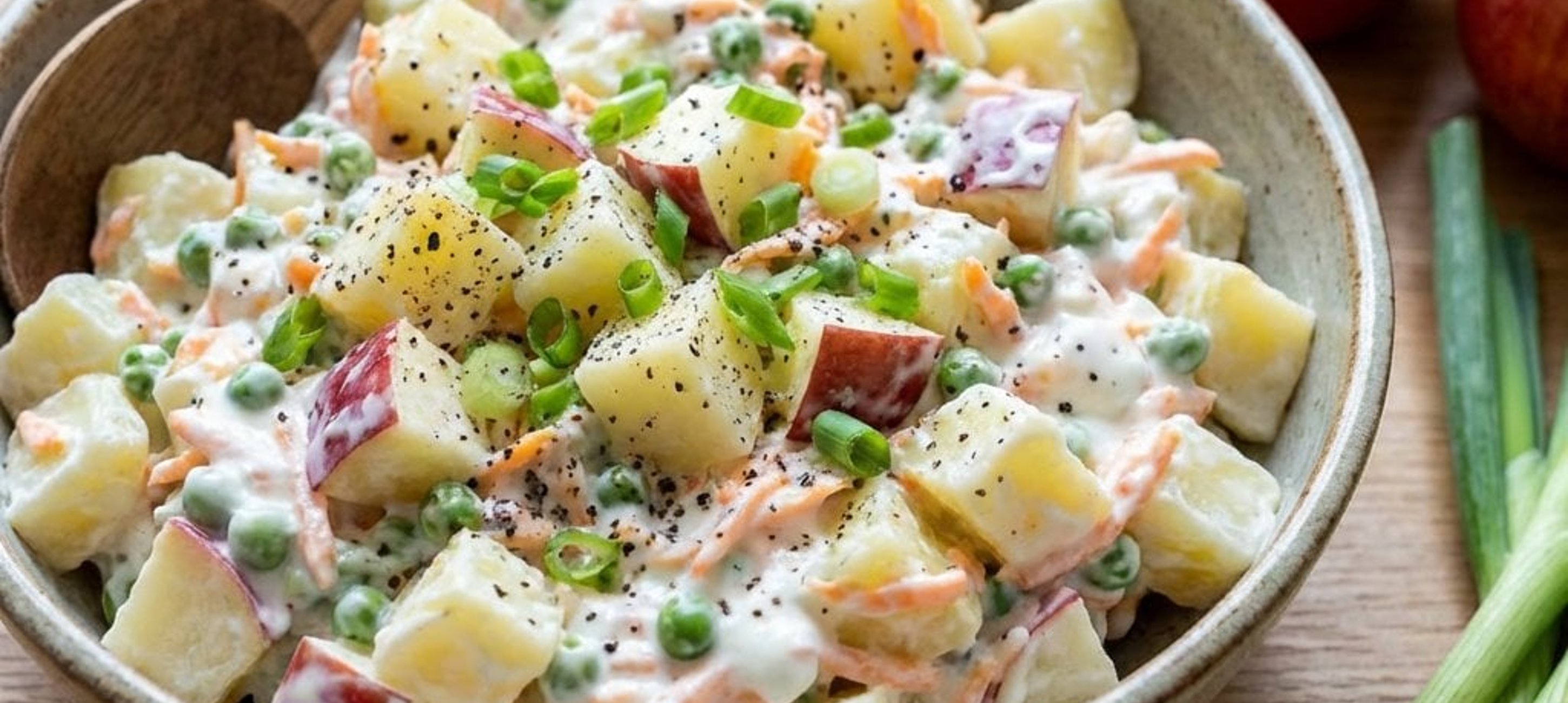 - 3A kihűlt burgonyát hámozzuk meg, kockázzuk fel, és tegyük egy nagy tálba. Adjuk hozzá a görög joghurtot, a borsót, az uborkát, a hagymát, a répát, a citromlevet, a sót, a borsot, az almát és a tojást, majd alaposan keverjük össze.
