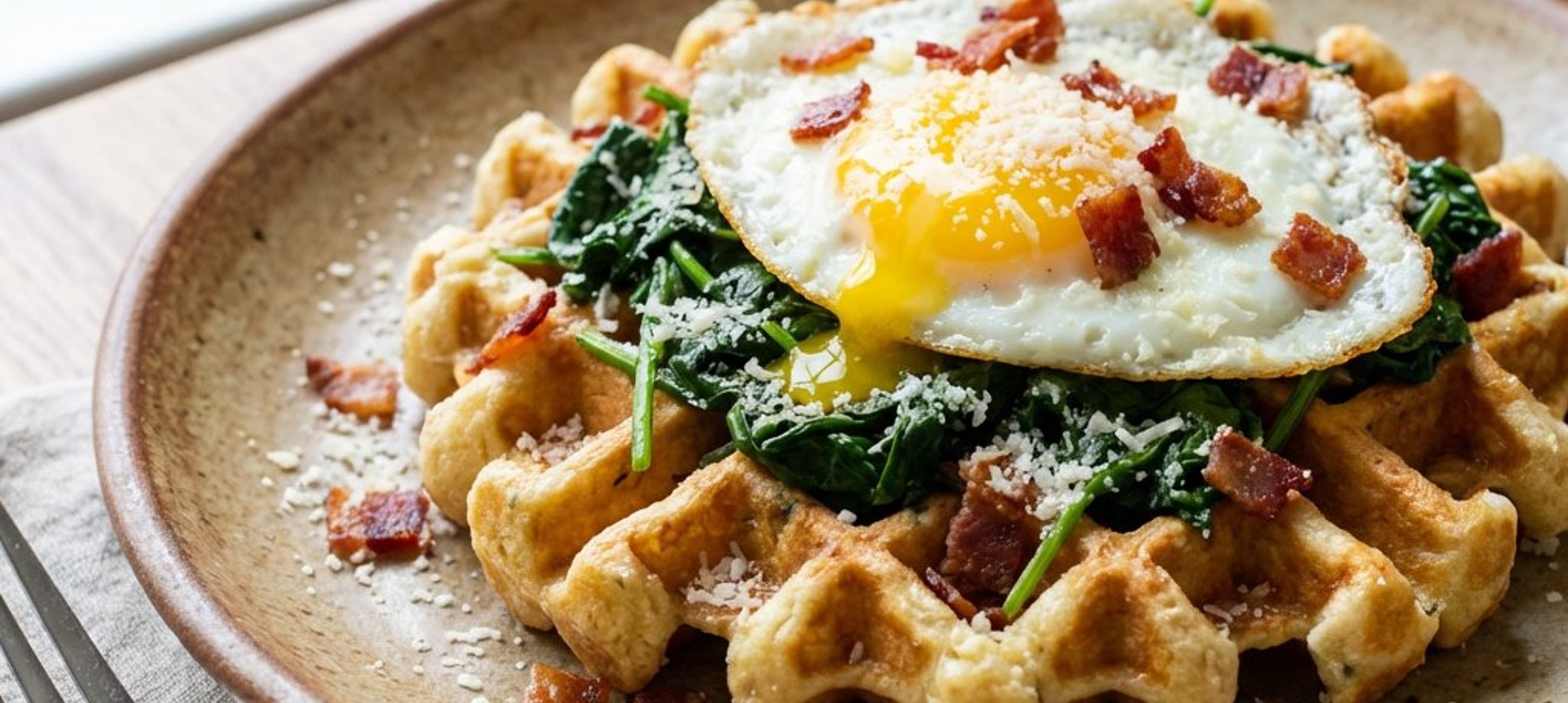 A gofri tésztájába kevert sült szalonna és fokhagyma különleges aromát ad, ami remekül harmonizál a friss spenóttal és a krémes tükörtojással. Ha még ropogósabb gofrikat szeretne, hagyja őket rácson hűlni egy percig tálalás előtt!