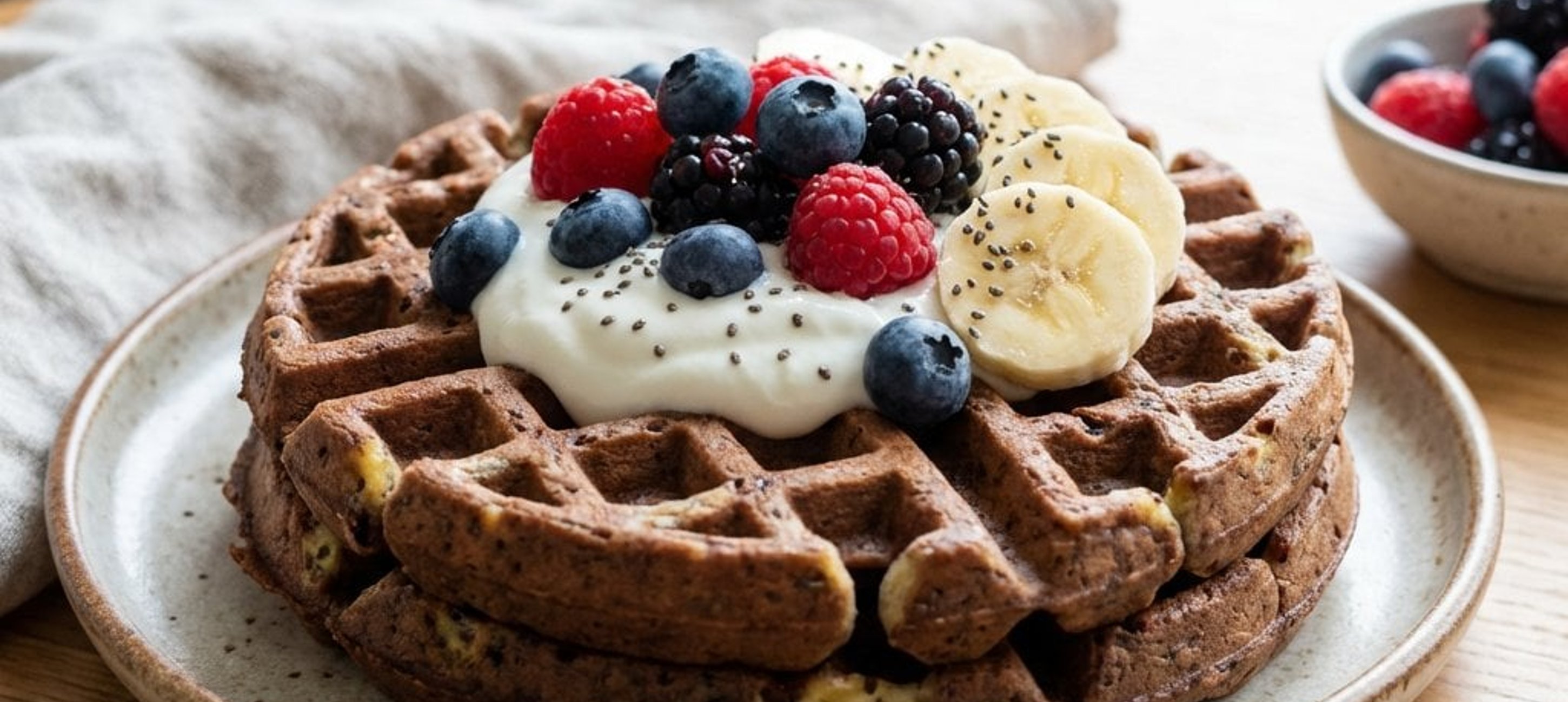 - 3Melegítsük elő a gofrisütőt, és ha szükséges, vékonyan kenjük át kókuszolajjal. Süssük a gofrikat körülbelül 10 percig, amíg átsülnek. Tálaljuk friss (vagy felengedett) erdei gyümölcsökkel és egy kanál tejföllel.