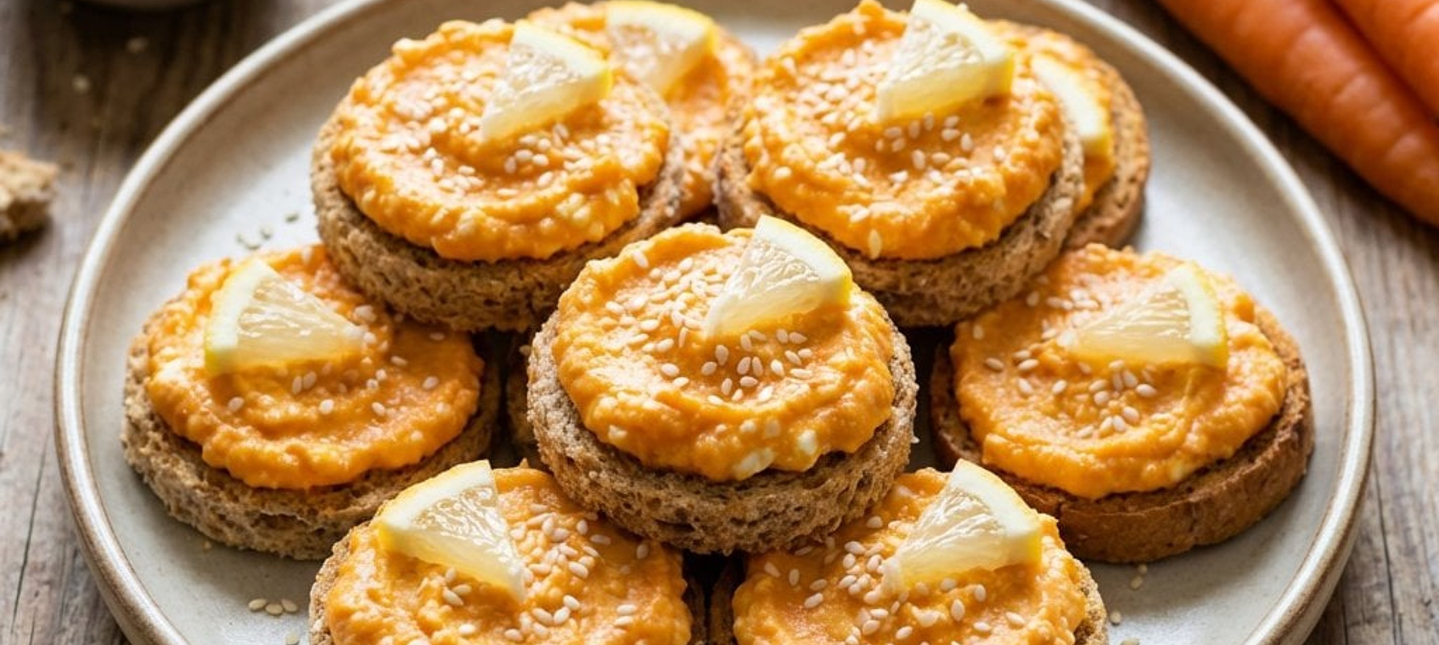 - 2A toast kenyér szeletekből pogácsaszaggatóval vagy egy pohár segítségével szaggassunk köröket. Kenjük meg őket bőségesen a sárgarépakrémmel.