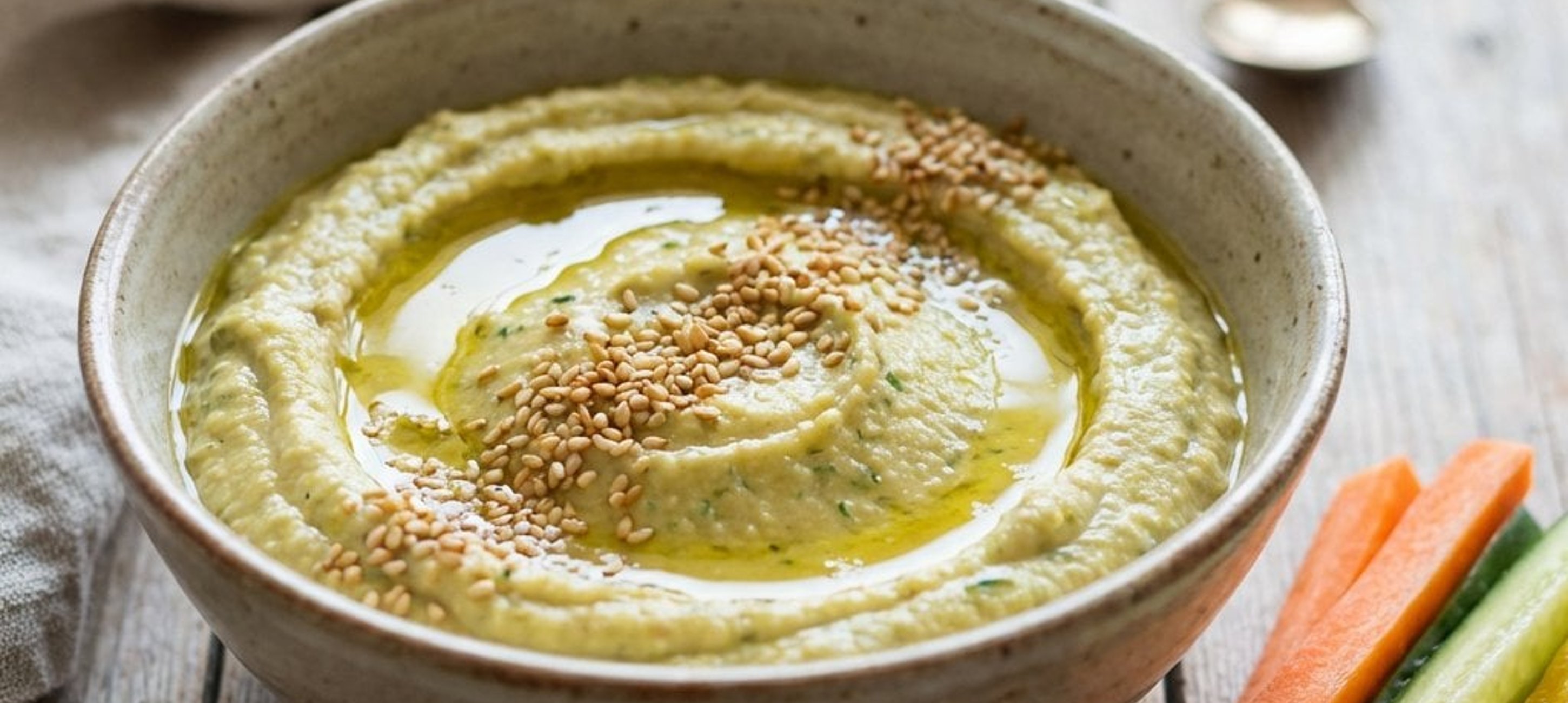 - 3A sült cukkinit tedd egy magas falú edénybe a tahinivel, az olívaolajjal, a zúzott fokhagymával és a sóval együtt. Botmixer segítségével mixeld az egészet krémesre és simára. Frissen tálalható.