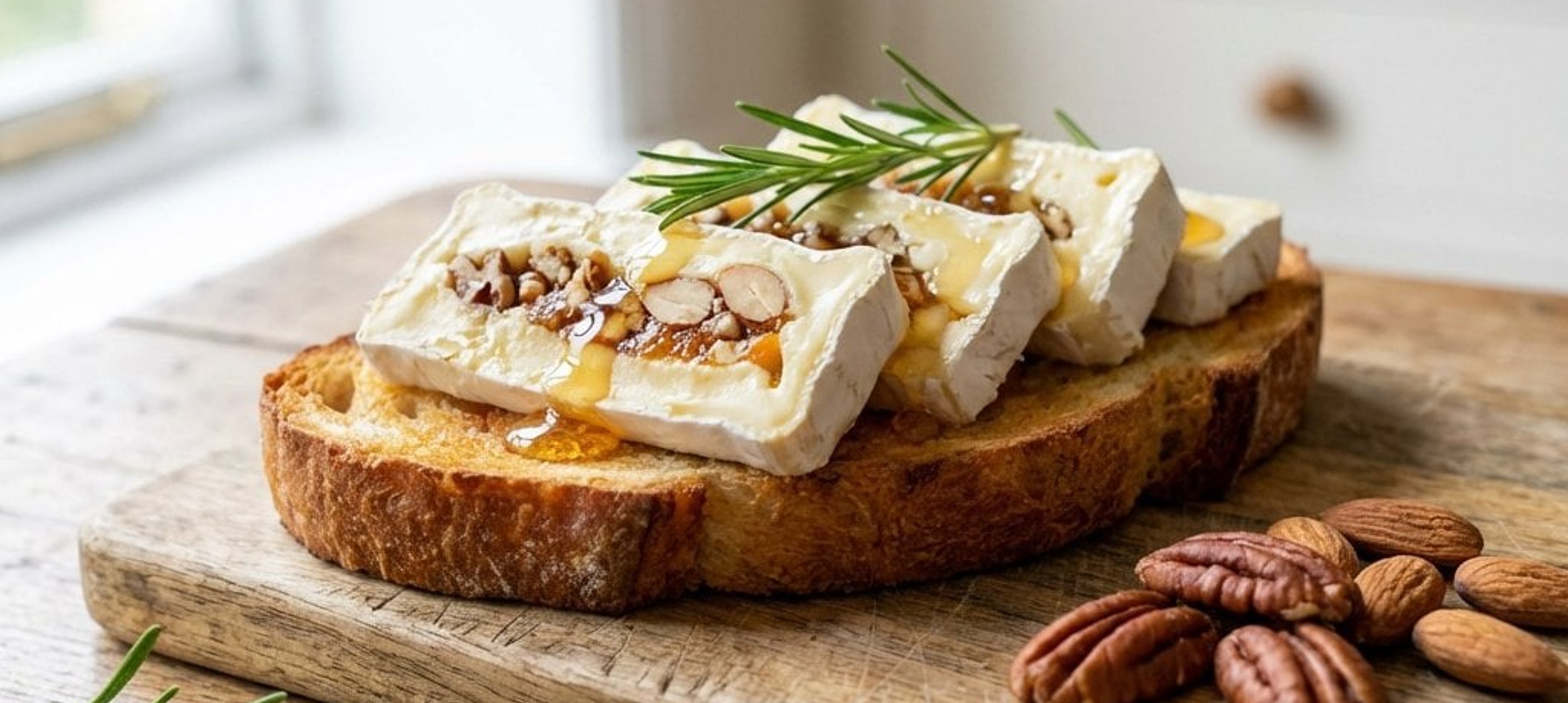 - 2A kovászos kenyérszeleteket pirítsuk meg száraz serpenyőben vagy kenyérpirítóban. A pirítósokra helyezzük rá a megtöltött, szeletekre vágott camembert sajtot.