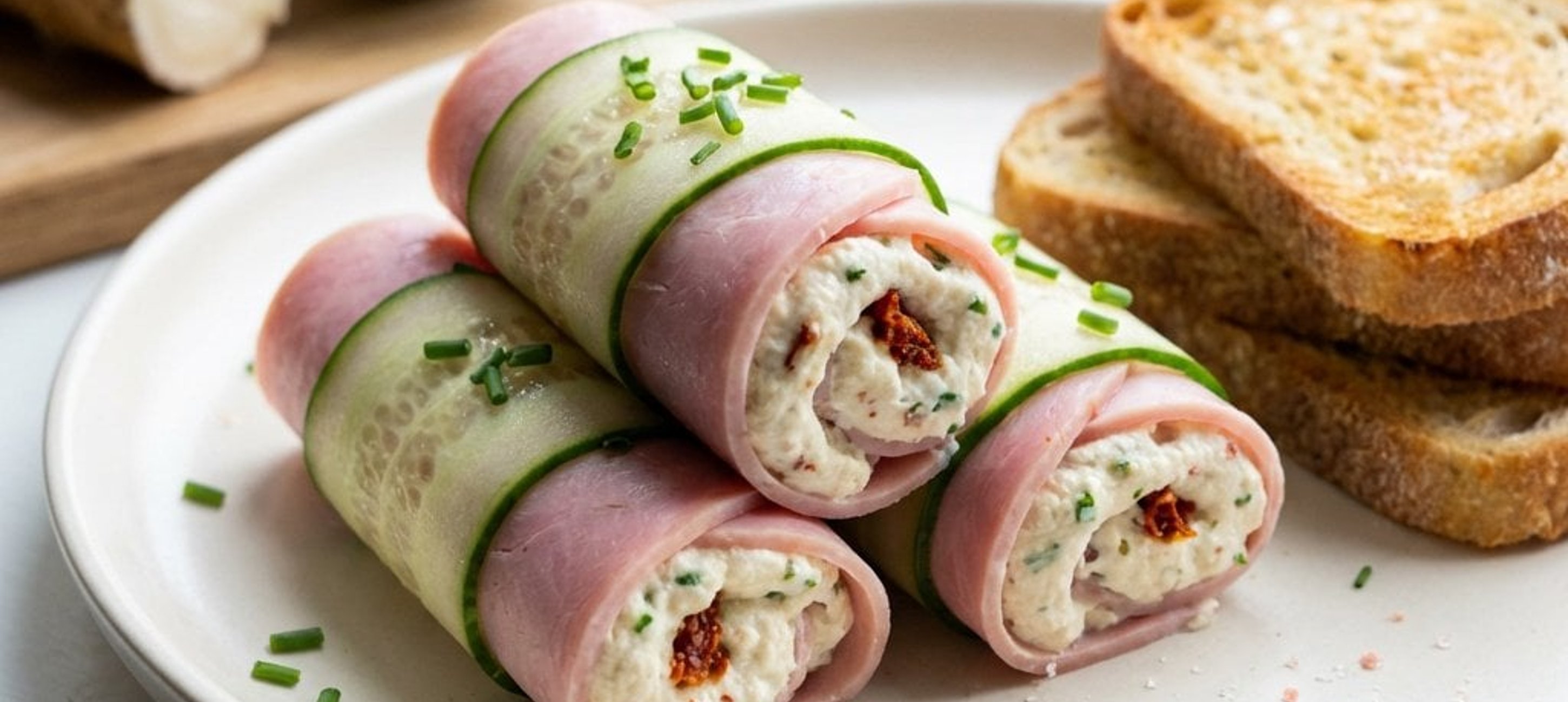 A sonkatekercsek töltéséhez használhatunk habzsákot is, így még esztétikusabb lesz a végeredmény. Az uborkaszalagok nemcsak díszítenek, hanem frissességet is adnak az ételnek.