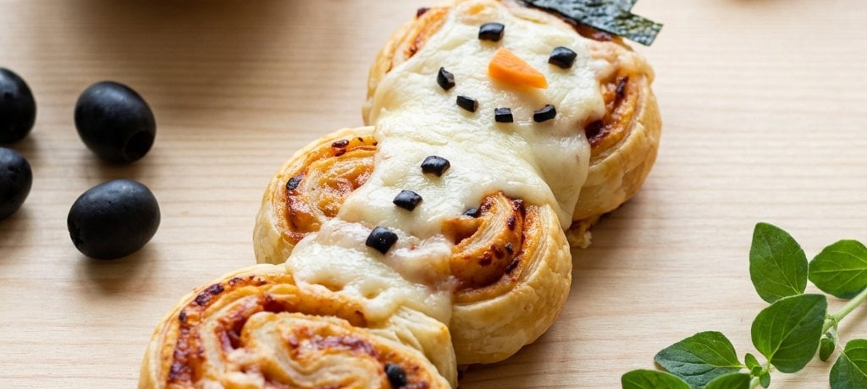 - 4A tésztatekercset vágjuk kb. 1 cm vastag szeletekre. Helyezzünk el hármat-hármat egymás alá a tepsiben, hogy hóember alakot formázzanak. Szúrjunk mindegyikbe egy hurkapálcát, hogy sütés után könnyen kézbe vehető legyen.