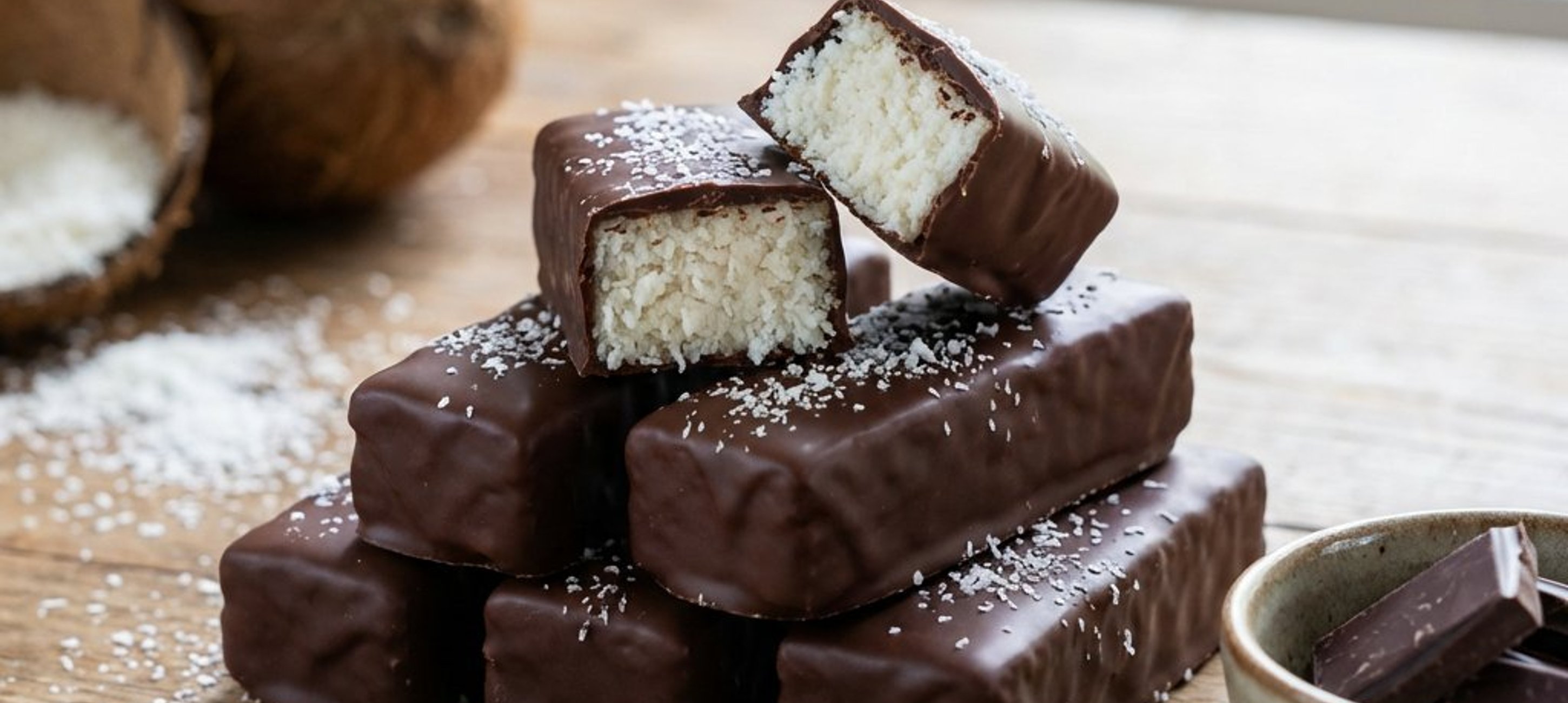 - 5Vedd ki a kókuszos alapot a fagyasztóból, és vágd tetszőleges méretű téglalapokra (pl. 4x10 cm). Minden darabot mártogass bele az olvasztott csokoládéba, majd csepegtesd le (legjobb sütőrácson). A bevont szeleteket tedd a hűtőbe 20 percre, amíg a csokoládé megköt.